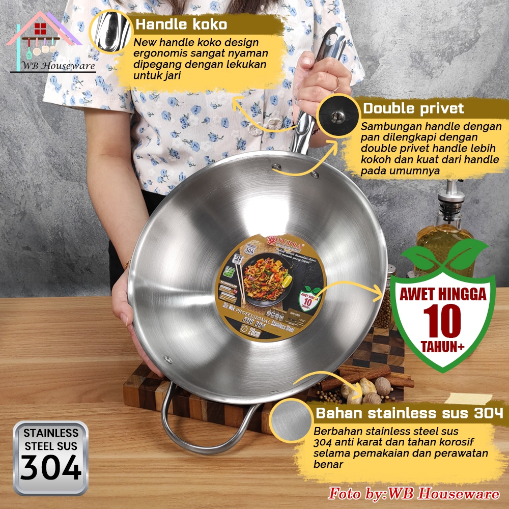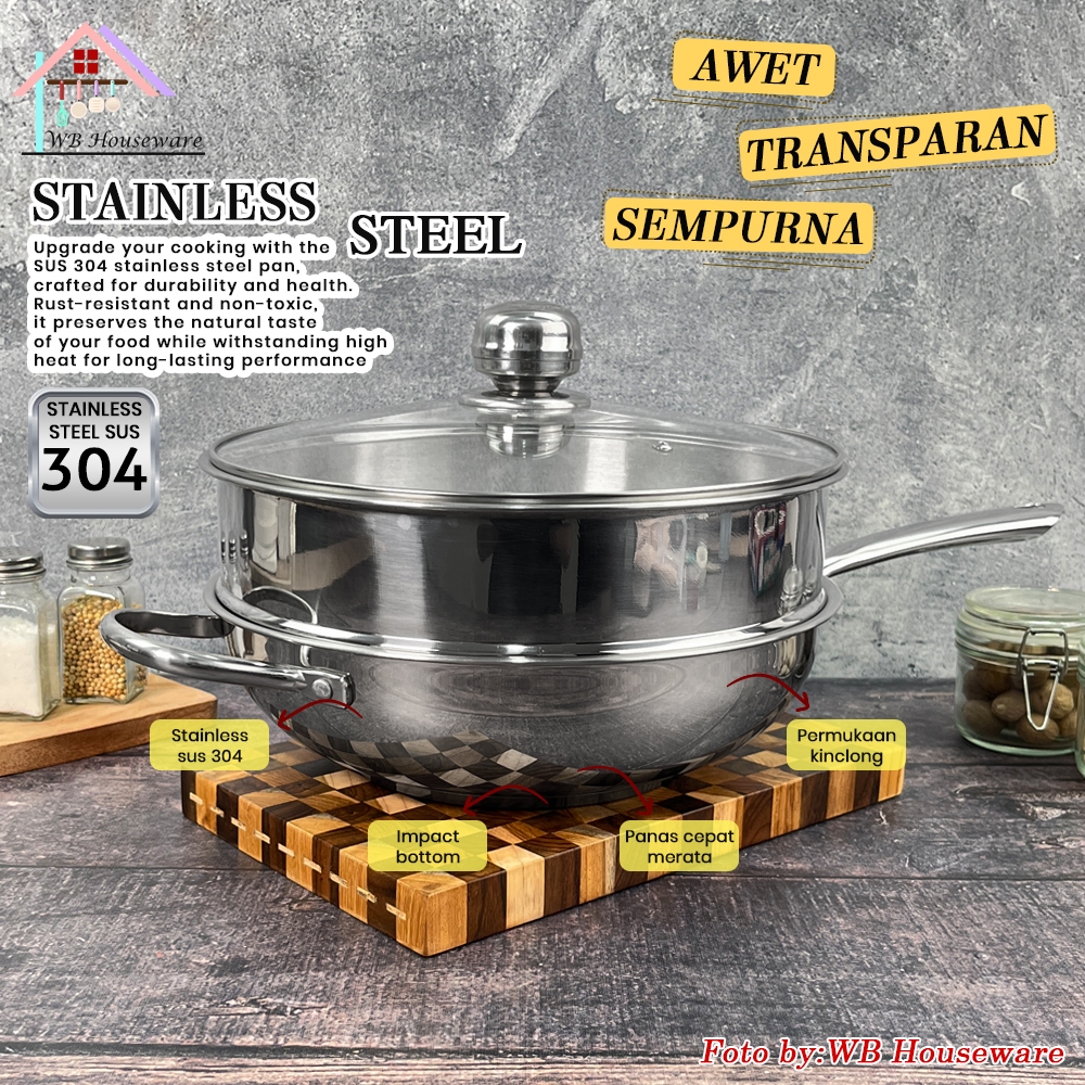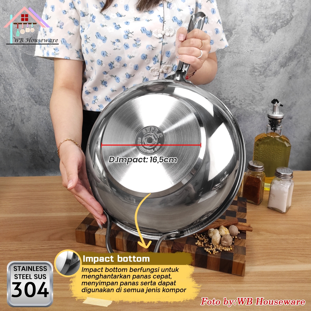 SUPRA New panci Stir wok 28cm + steamer + tutup kaca viliron stainless SUS 304 professional impact series / wajan masak