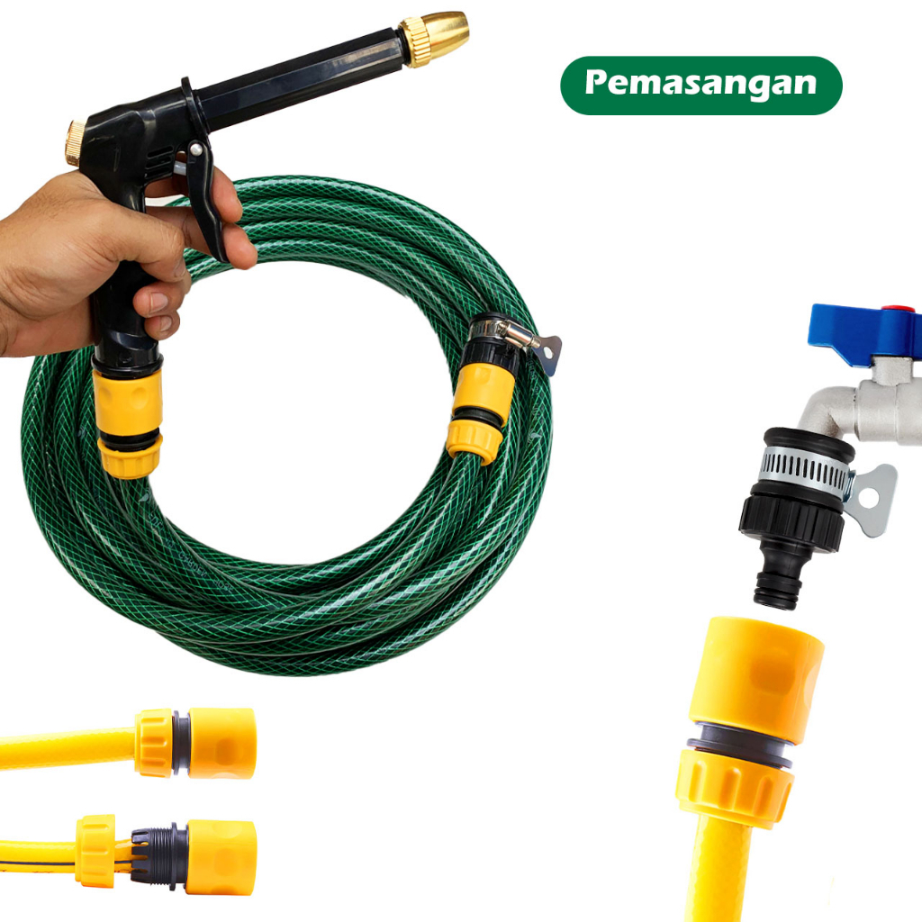 Paketan Universal 15 Meter Selang Semprotan Air Semprot Cuci Motor Mobil Siram Taman Benang Hijau Komplit Tinggal Pasang Cocok Untuk Semua Kran Selang Air Serat Benang