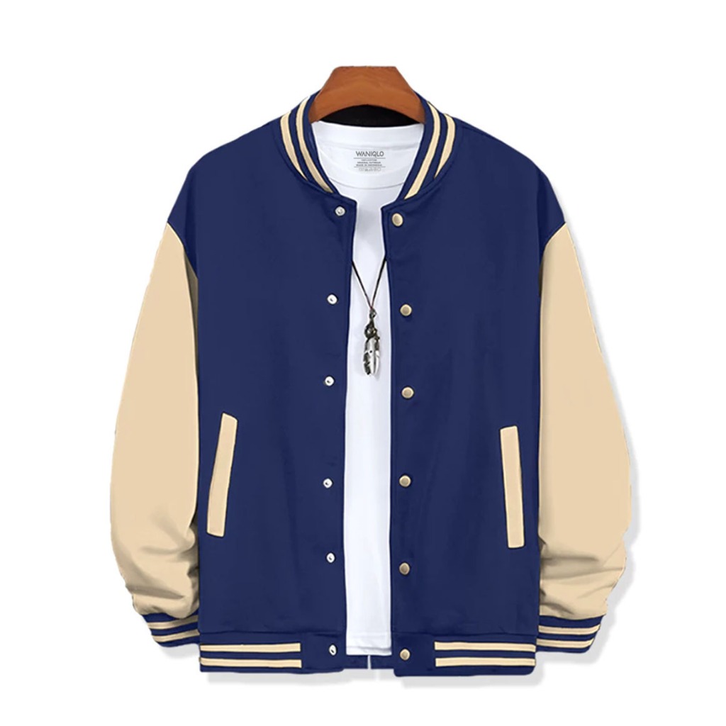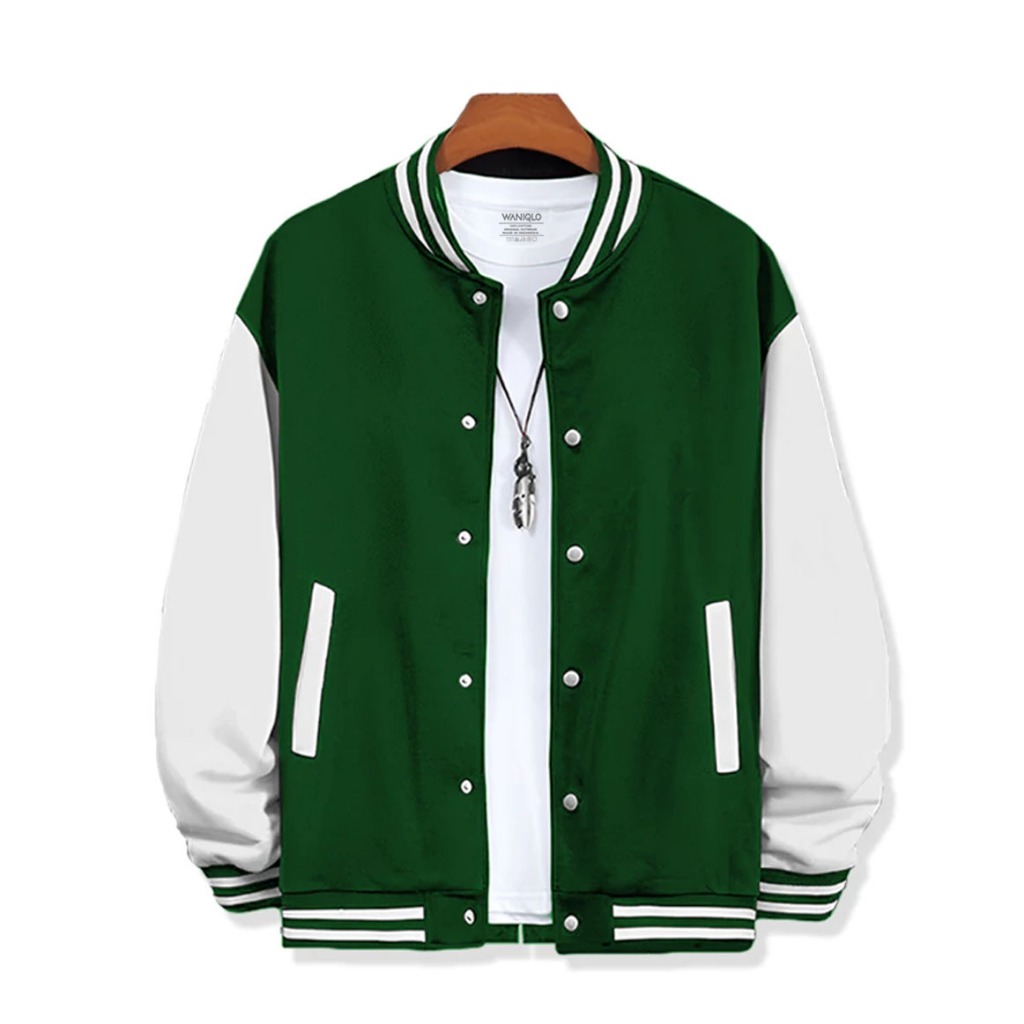 Waniqlo - Jaket Varsity Baseball Kancing Polos- Hitam Putih