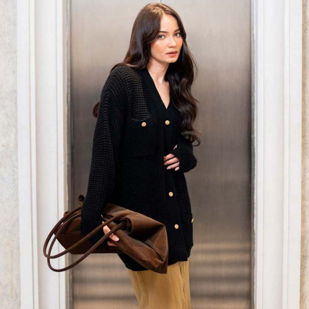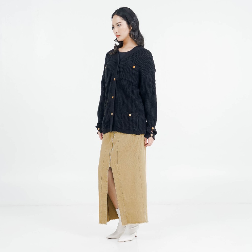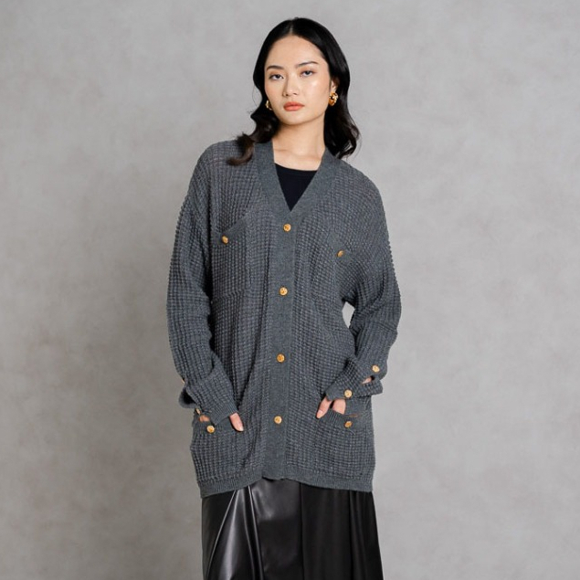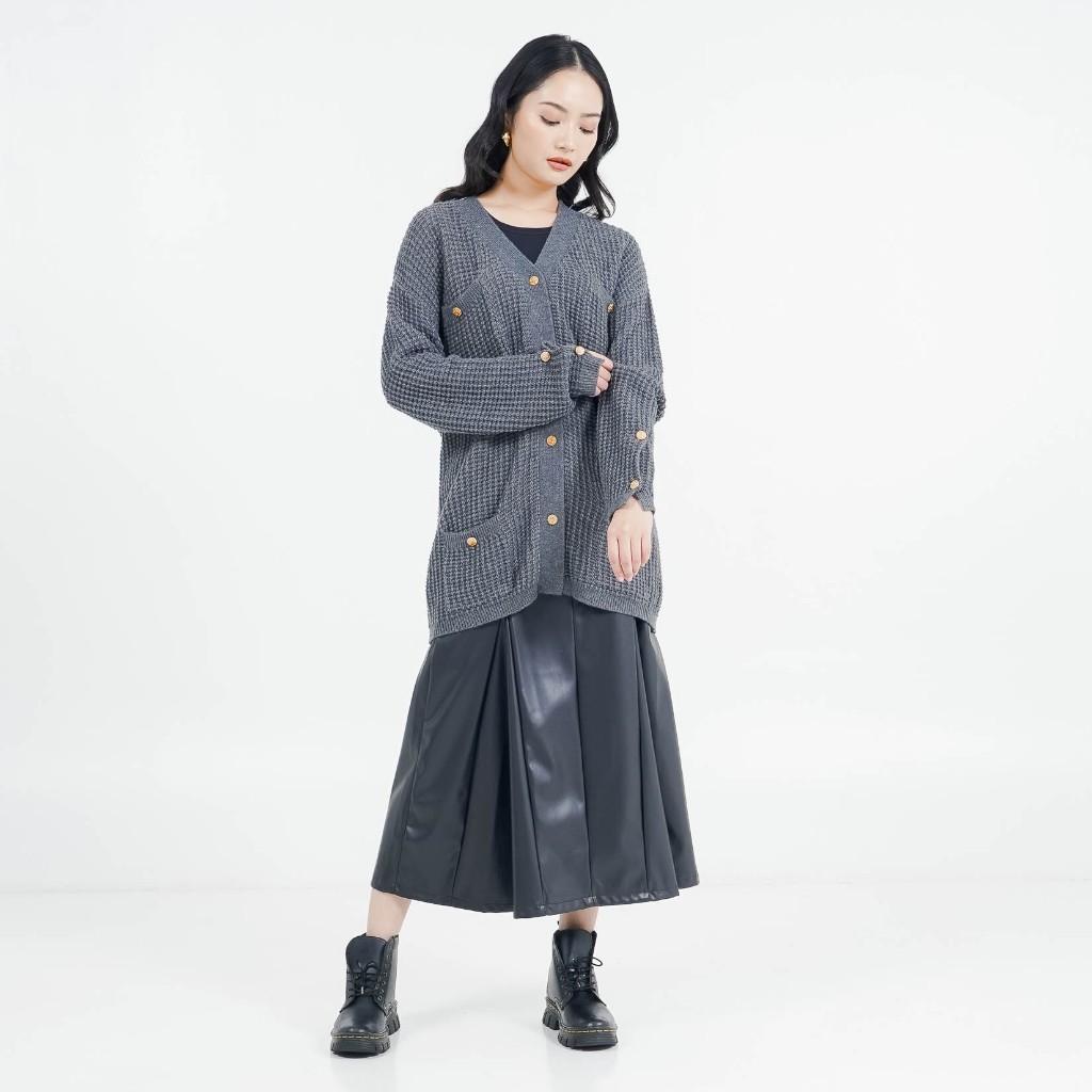 Enzy Storia X This Is April Baju Atasan Rajut Wanita Lengan Panjang Hijab Friendly ES Oralee Textured Cardigan Black & Grey