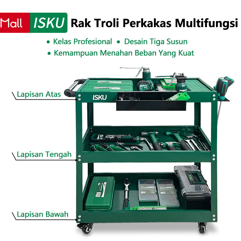 ISKU Trollies Bengkel Rak 3 Susun Trolly Trolley perkakas tools Tool Cart Rak /Alat Perkakas Trolly Galon/Trolley Alat K