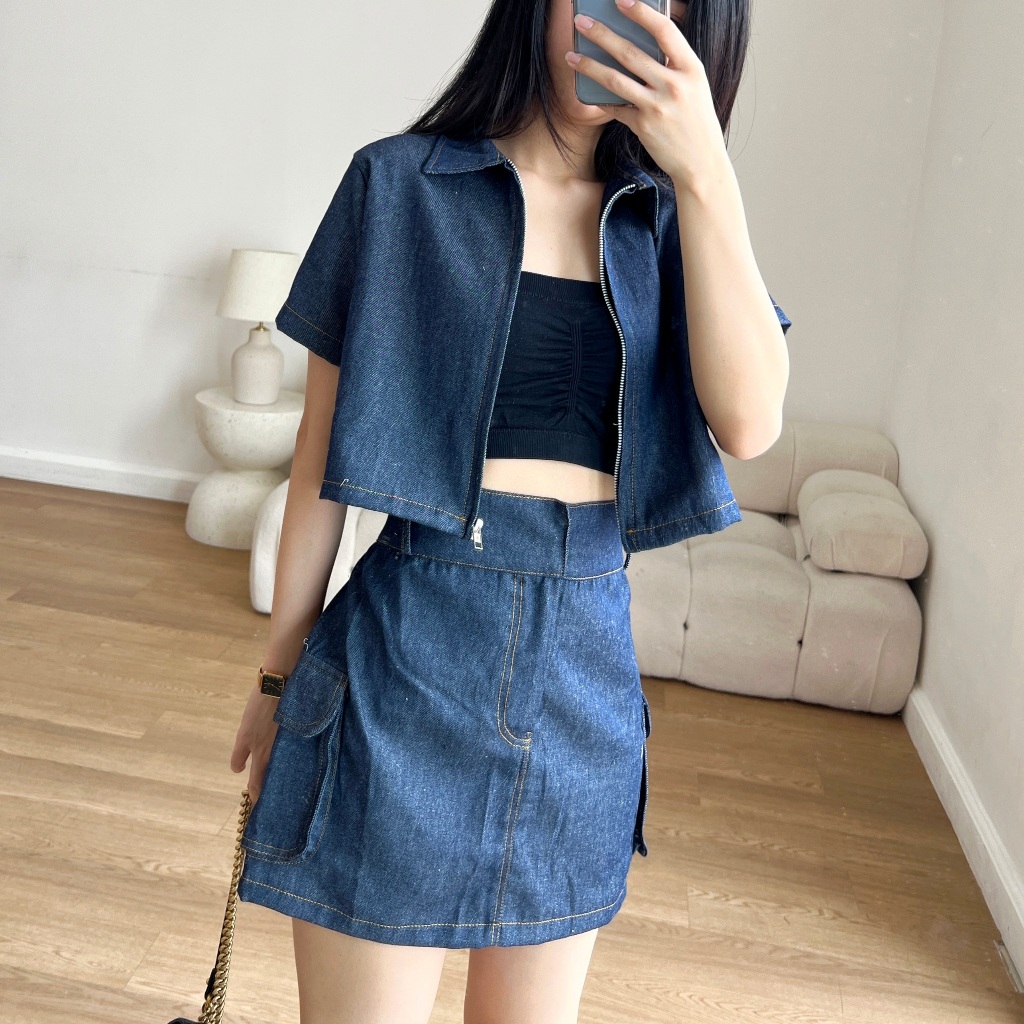 Halostylo Karin Denim Set Setelan Wanita Crop Top Reseleting + Rok Cargo Mini Skirt