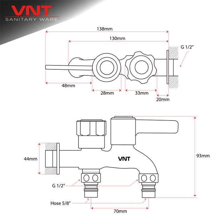 VNT Kran Air Cabang Double 1/2 Inch BWT2-001 Keran Mesin Cuci Taman Tembok