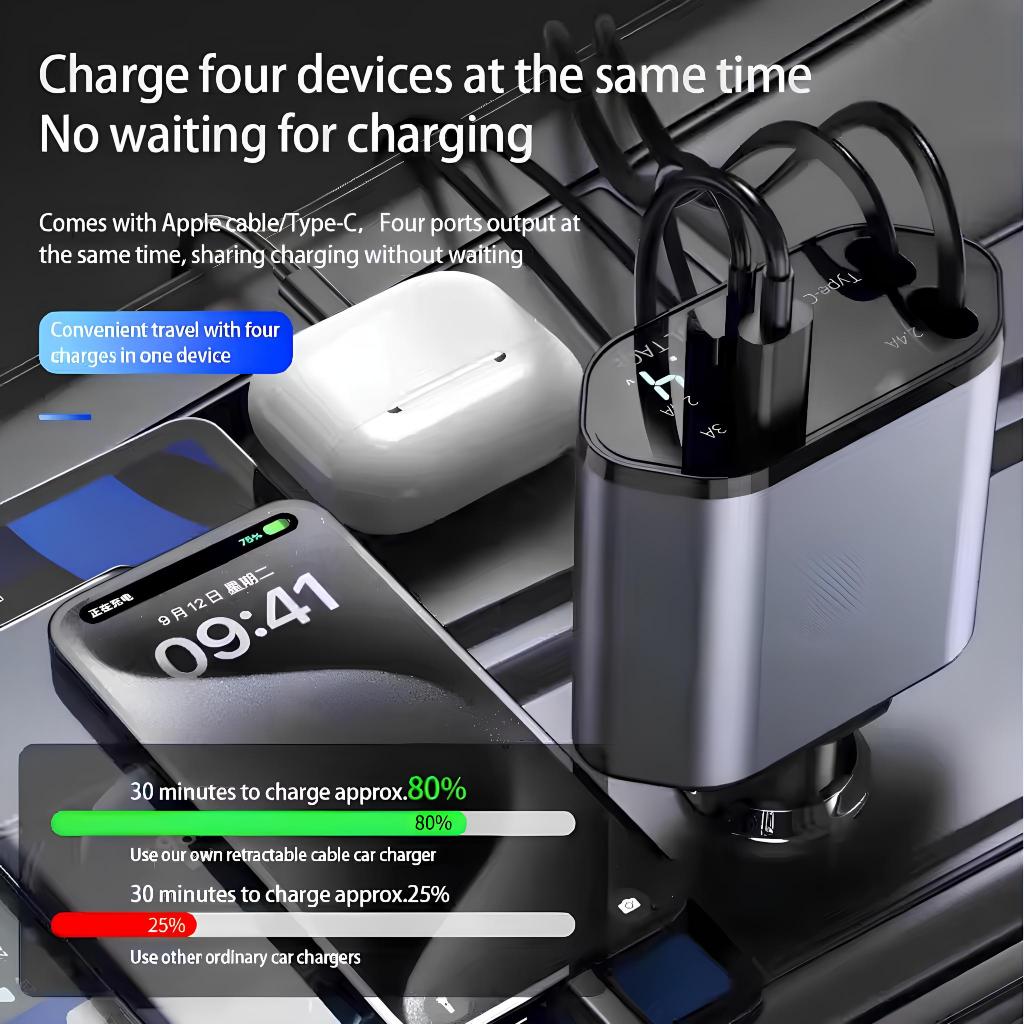 UPLU 120W Fast Charging Car Charger Mobil & Motor Rectractable Cable 4 In 1 Type-C Dan Iphone