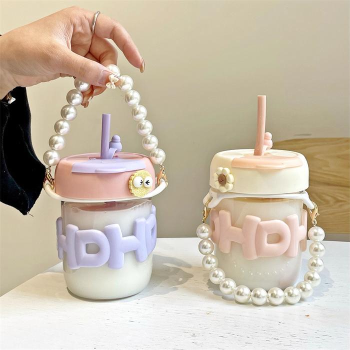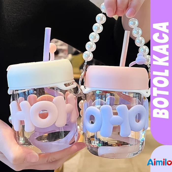 Botol Kaca 350ml Tumblr Minum Anak Lucu Tahan Panas Aesthetic Mug Kopi Teh - PINK | F133-1