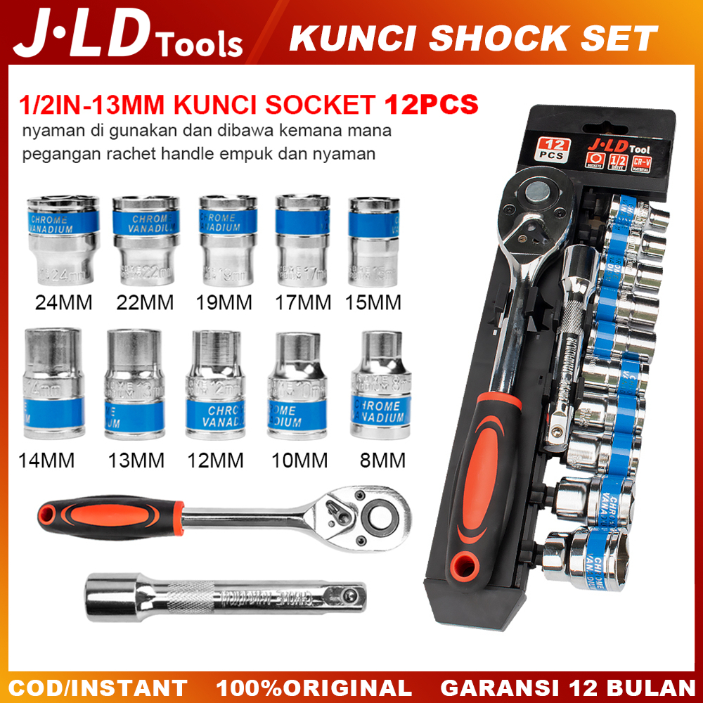 JLD kunci shock set 12Pcs 4-24mm 1/2''-1/4'' kunci Socket Motor Lengkap Socket tool CR-V Kunci shock Wrench set lengkap