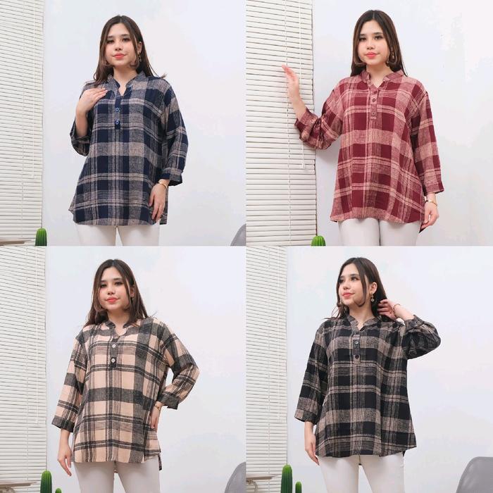 Kemeja Wanita Motif Kotak-Kotak Bahan Rayon Premium Ld 110 // Ld 120 Kancing 3 - Lengan Kancing // Full Kancing - Kotak