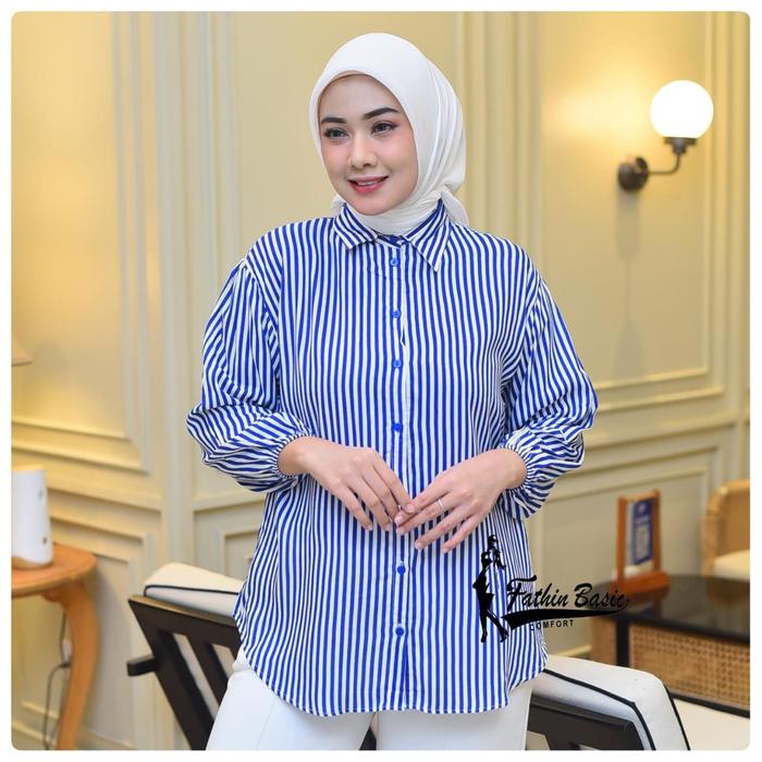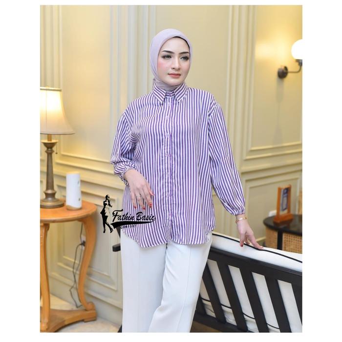 Izze Atasan Rayon Oversize Wanita Kemeja Salur Rayon Premium Atasan Wanita Kekinian Lengan Balon Baju Motif Garis-Garis