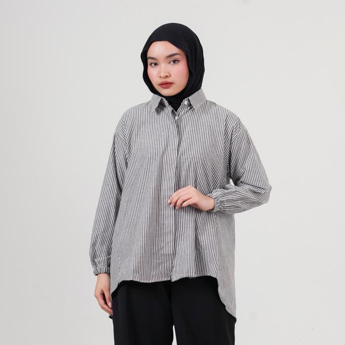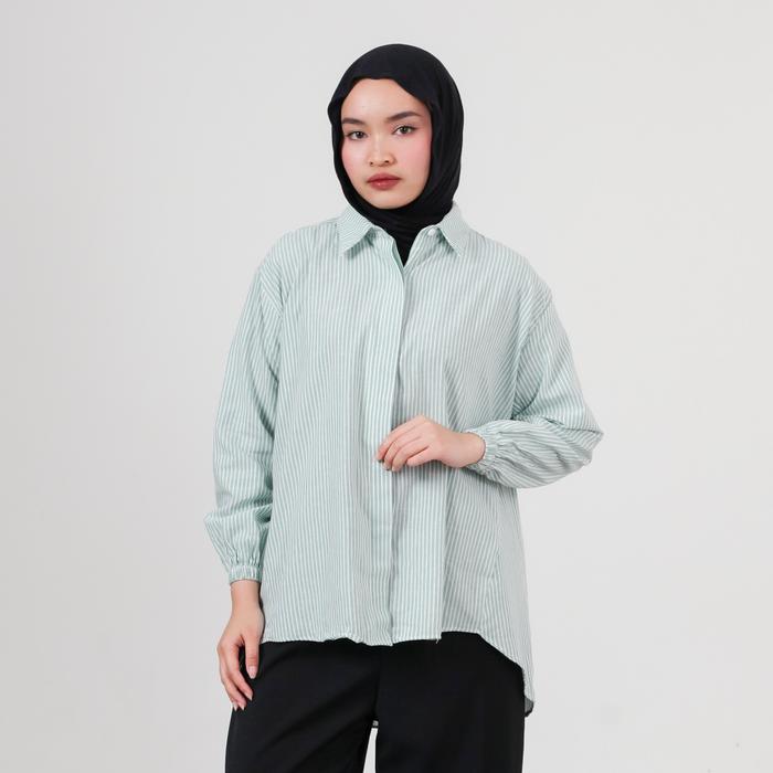 Elf Store - Kara Kemeja Atasan Salur Stripe Katun Ld Jumbo Wanita Muslim Panjang Kekinian Baju Oversize - Skyblue, M ( L
