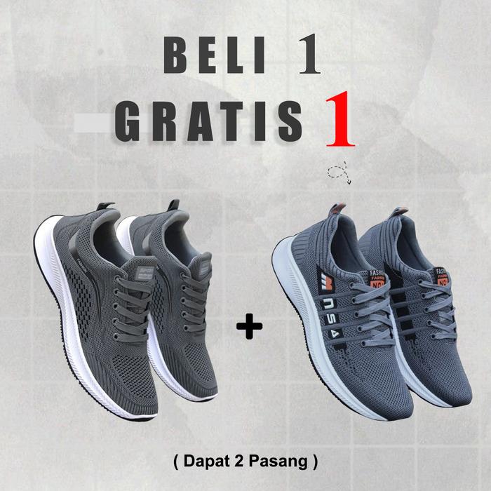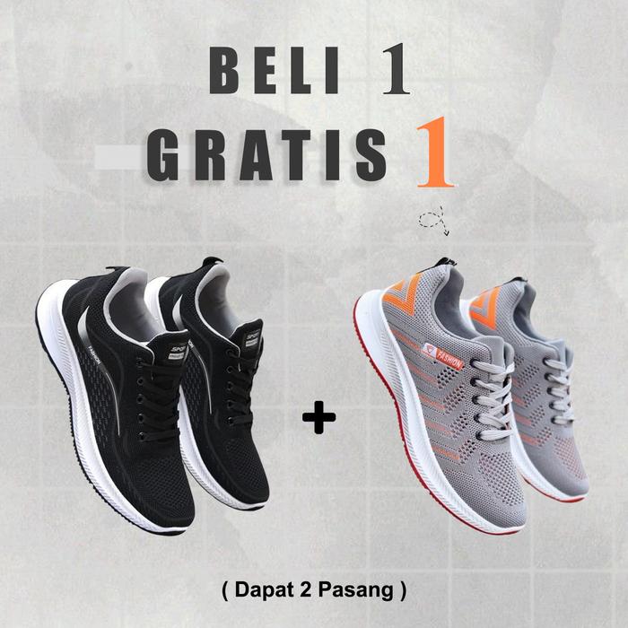 [Star]BUY 1 GET 1 Sepatu Sport Pria Kasual & Trendy Gratis 1 Pasang Casual Sneakers - BJN HITAM + ID ABU, 39