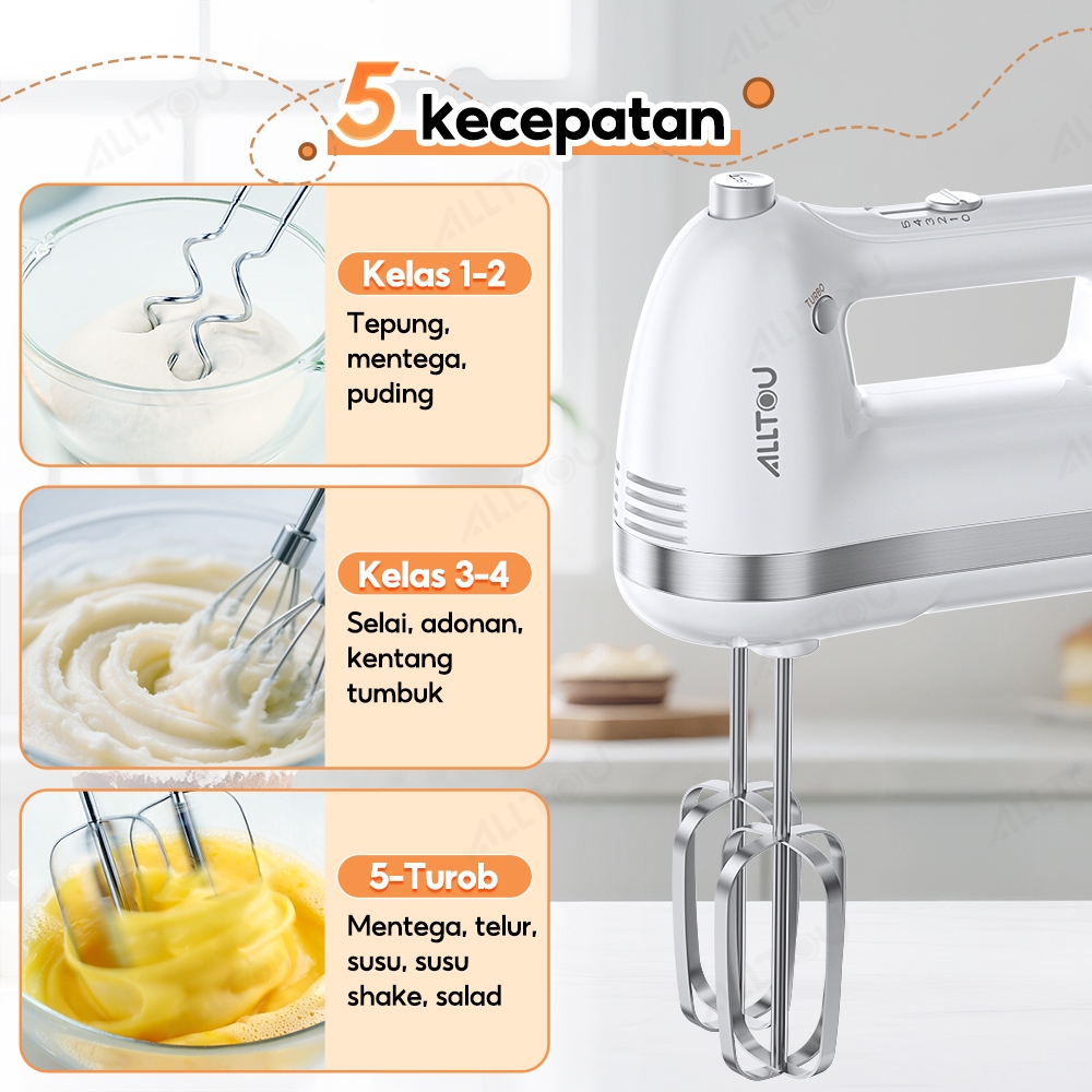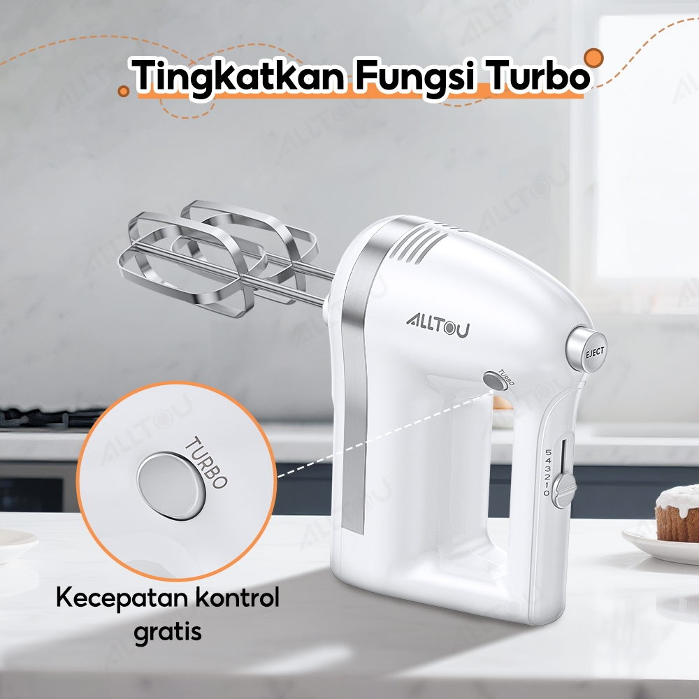 ALLTOU Hand Mixer Fungsi Turbo Pengaduk 5 Kecepatan / Hand Mixer Free 6 Buah Alat Pengocok Putih Mixer Terlaris