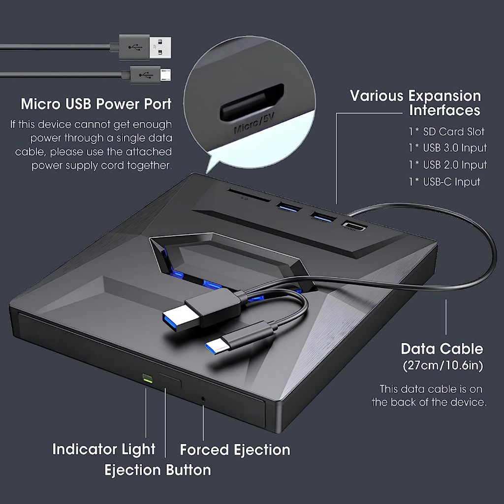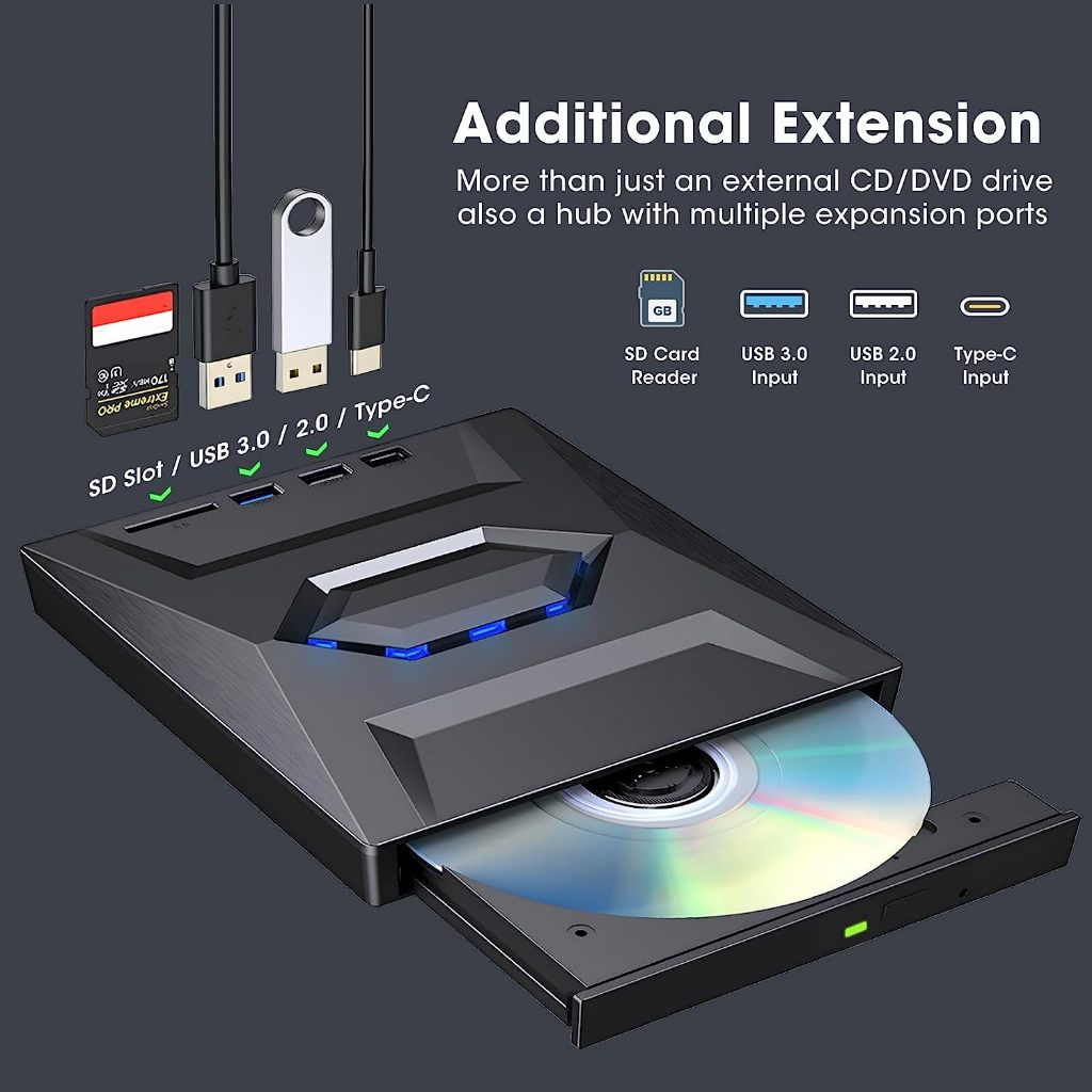 External DVD Drive for Laptop USB 3.0 Type-C Portable CD/DVD Optical Drive Player Writer CD Burner with 2 USB 3.0 Ports, Type C Port SD Card Reader for Laptop PC MacBook Mac Windows Linux OS