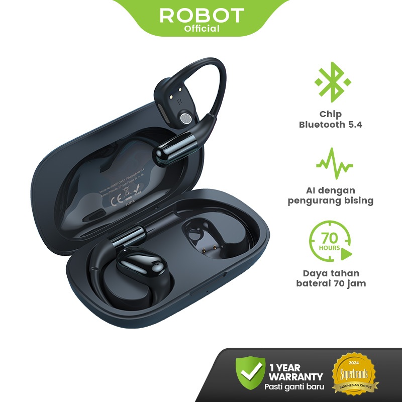 ROBOT True Wireless Open Ear Headphone Earphone Sport Running PlayTime 70 Hours Headset Bluetooth 5.4 Adjustable Ear Ho