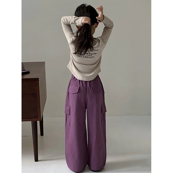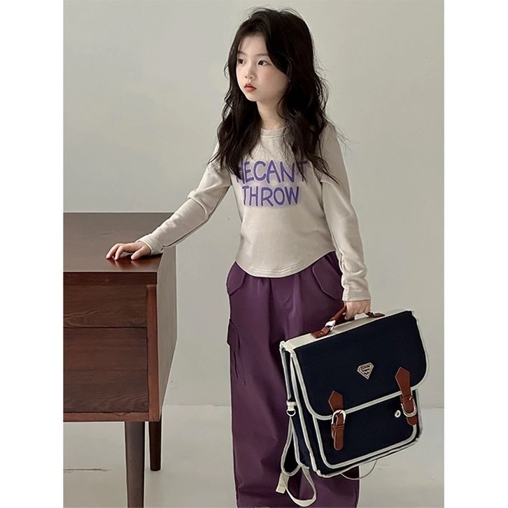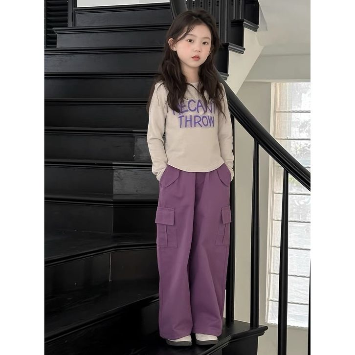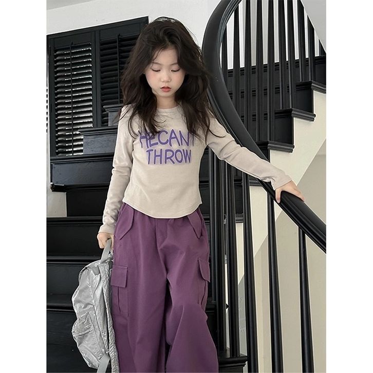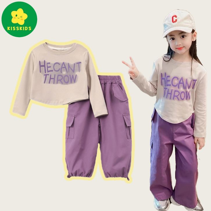 [Star] Setelan Anak Perempuan Usia 2-10 Tahun Oneset Kaos Lengan Panjang Dan Celana Cargo Panjang Warna Ungu Import