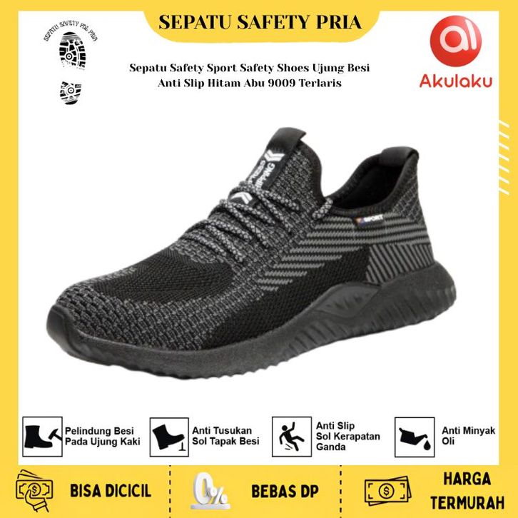 Sepatu Safety Sport Safety Shoes Ujung Besi Anti Slip Hitam Abu 9009 Terlaris