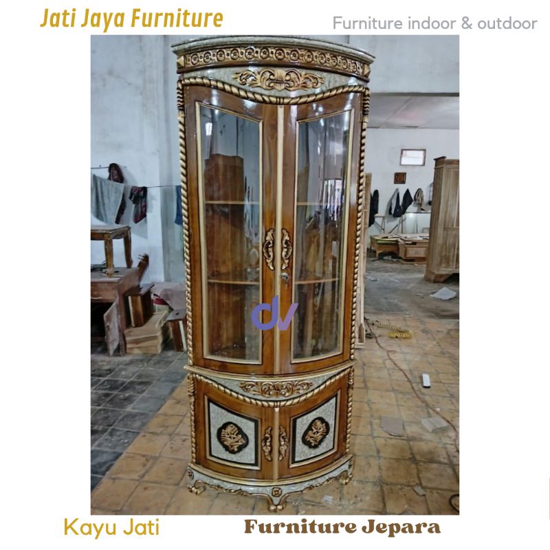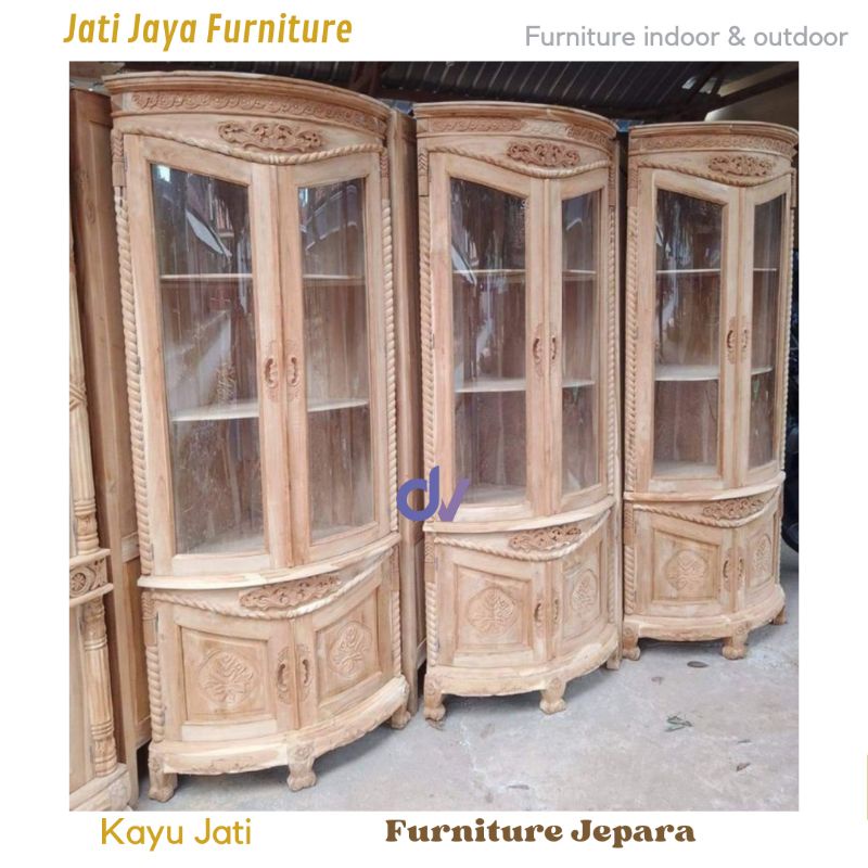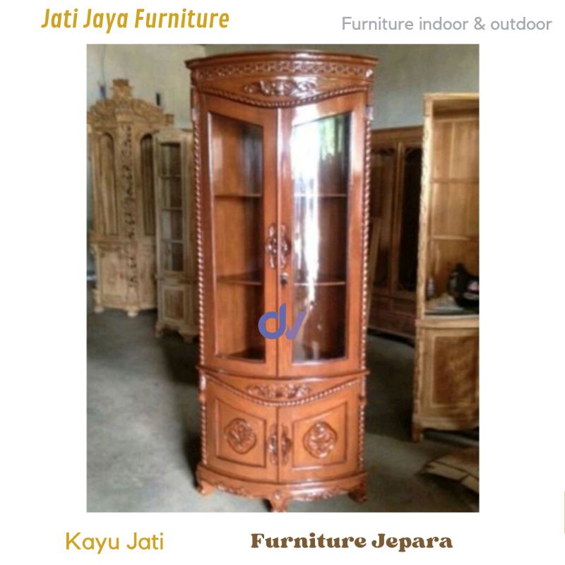 Lemari pojok kayu jati / lemari sudut hias r tamu lemari pajangan kaca