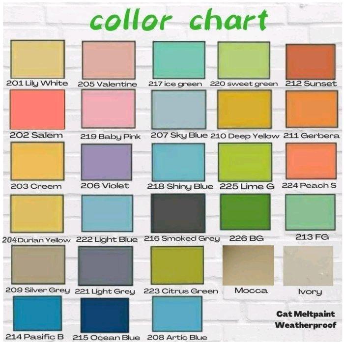 201 Lily White, 202 Salem, 203 Cream, 204 Durian Yellow, 205 Valentine, 206 Violet, 207 Sky Blue, 208 Artic Blue, 209 SILVER GREY, 210 Deep Yellow, 211 GERBERA, 212 SUNSET, 213 Fresh Green, 214 Fasific blue, 215 Ocean Blue, 216 Smoked Grey, 217 Ice Green, 218 Shiny Blue, 219 Baby Pink, 220 Sweet Green, 221 Light Grey, 222 Light Blue, 223 Citrus Green, 224 Peach Salem, 225 Lime Green, 226 Banna Green, Hitam, Ivory, Mocca, Putih, Putih Kebiruan