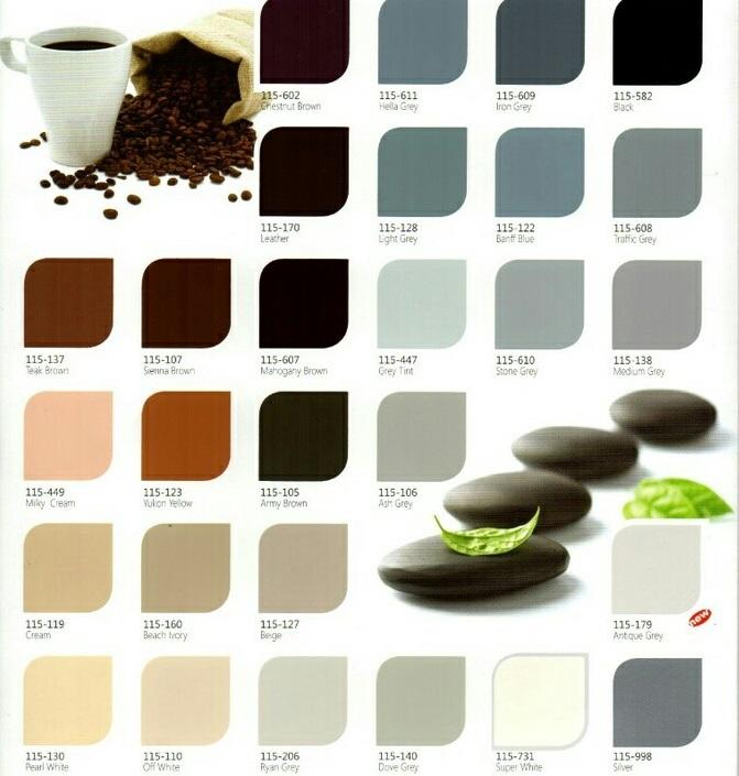 ARM BRW 105, ASH GREY 106, BANFF BLUE 122, BEACH IVORY 160, BEIGE 127, BLACK 582, CHESN BRW 602, CREAM 119, DOVE GREY 140, GREY TINT 447, HELLA GREY 611, IRON GREY 609, LEATHER 170, LIGHT GREY 128, MDM GREY 138, MHGN BRW 607, MILK CREAM 449, OFF WHITE 110, PEARL WHITE 130, RYAN GREY 206, SINNA BRW 107, SPR WHITE 731, STN GREY 610, TEAK BRW 137, TRFC GREY 608, YUKON YLW 123