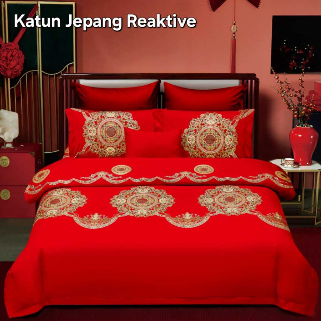 Bedcover Set Katun Jepang Reaktive Motif Chinese Wedding / Sprei Wedding Sanghie / Bedcover Wedding Merah / Wedding Gift