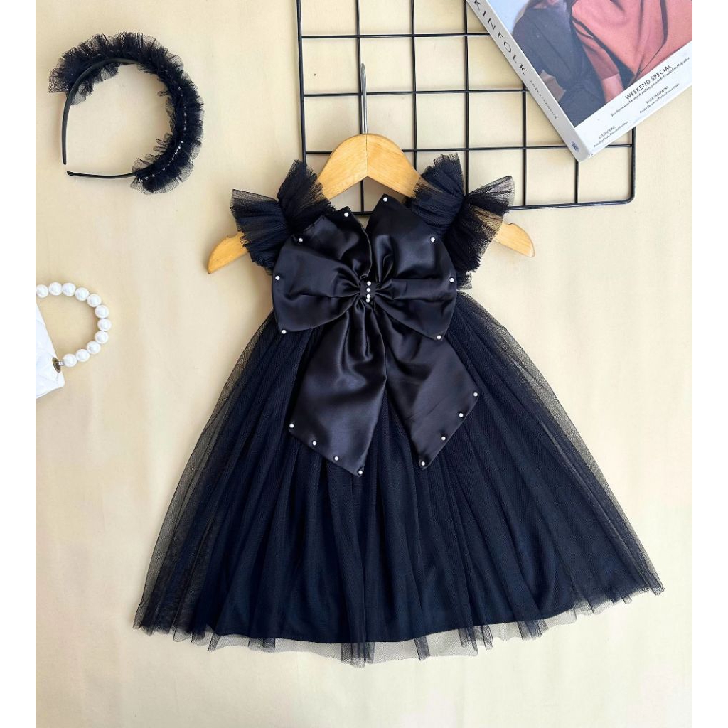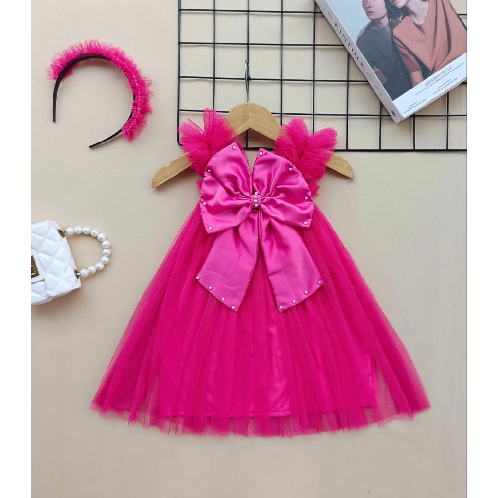 [READY STOCK] Dress pesta tutu tile anak dan bayi burgundy mutiara mewah bigbow pita satin besar pink denim blue jeans m