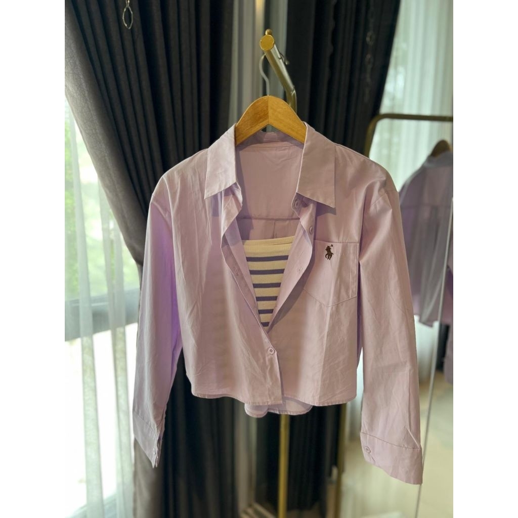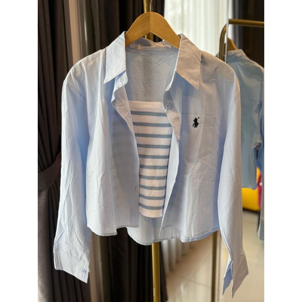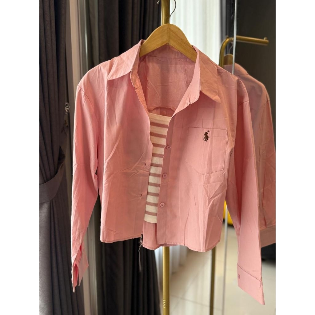 Kemeja Crop Top Pollo + Inner Salur Import Bkk Korean Style One Set Kemeja With Inner