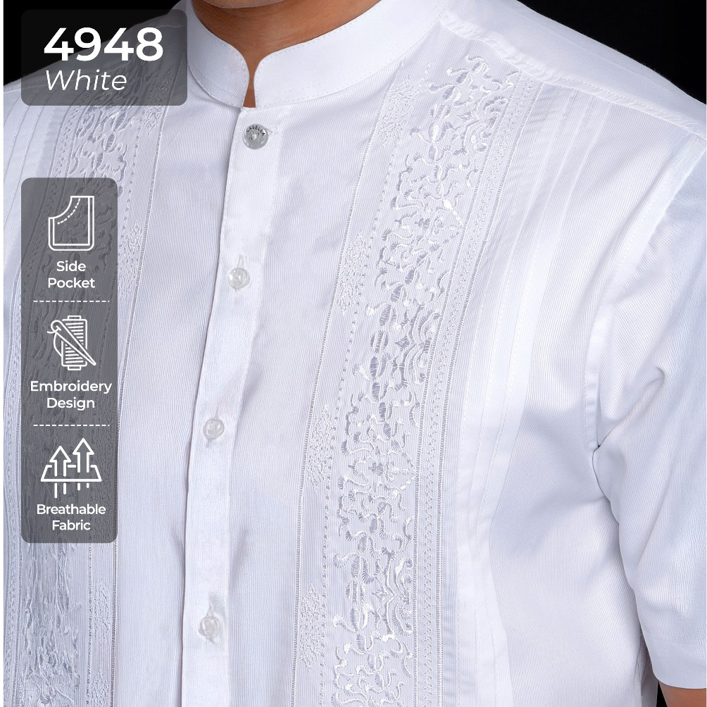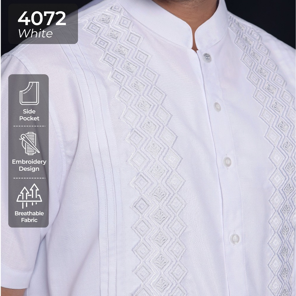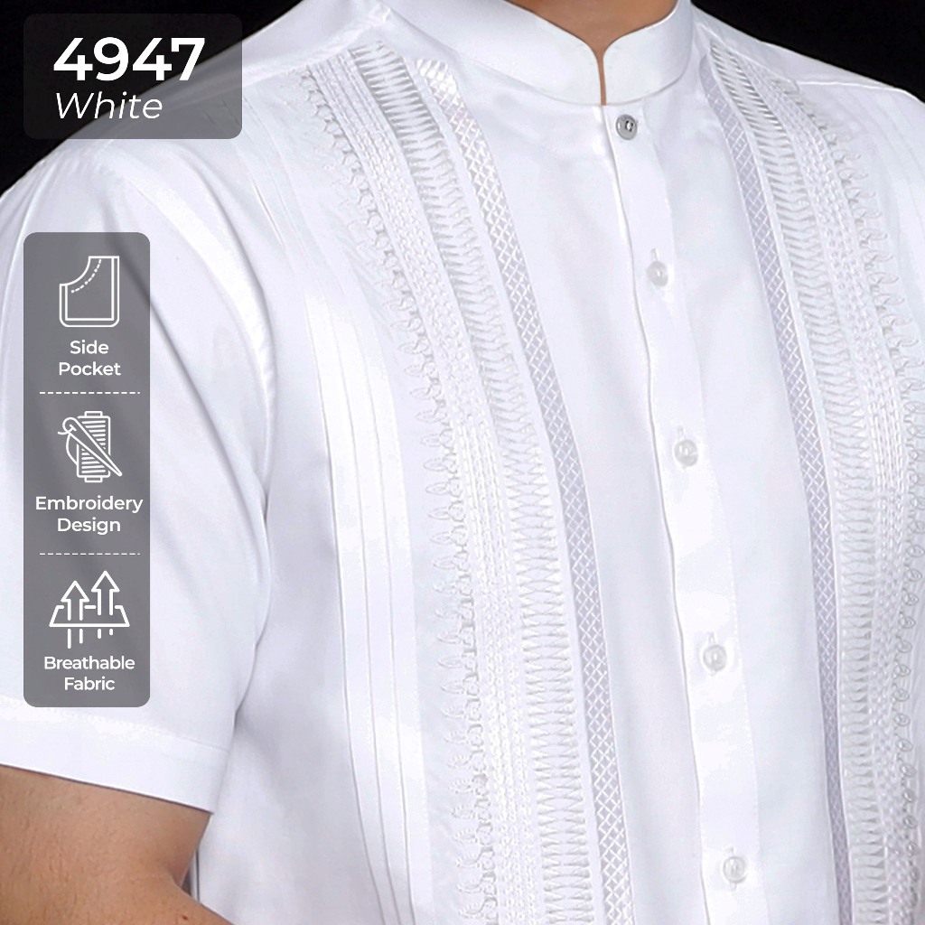 Casella Baju Koko Pria Lengan Pendek Pleats Embroidery | Baju Koko Putih Lengan Pendek