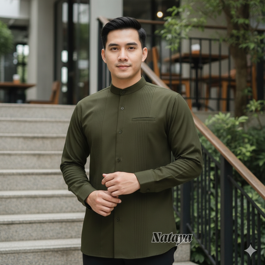 Baju Koko Pria - Koko Lengan Panjang Motif Abyan Warna Cokelat Bahan Katun Toyobo Premium Adem