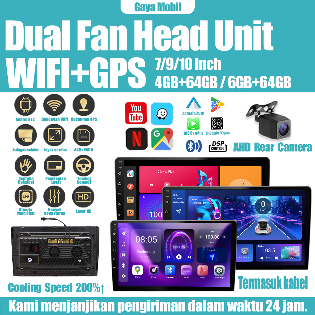 Dual Kipas Head Unit Android 14 7/10 inci 6+64G Dukungan WiFi GPS Carplay IPS Screen Navigasi Kamera AHD universal