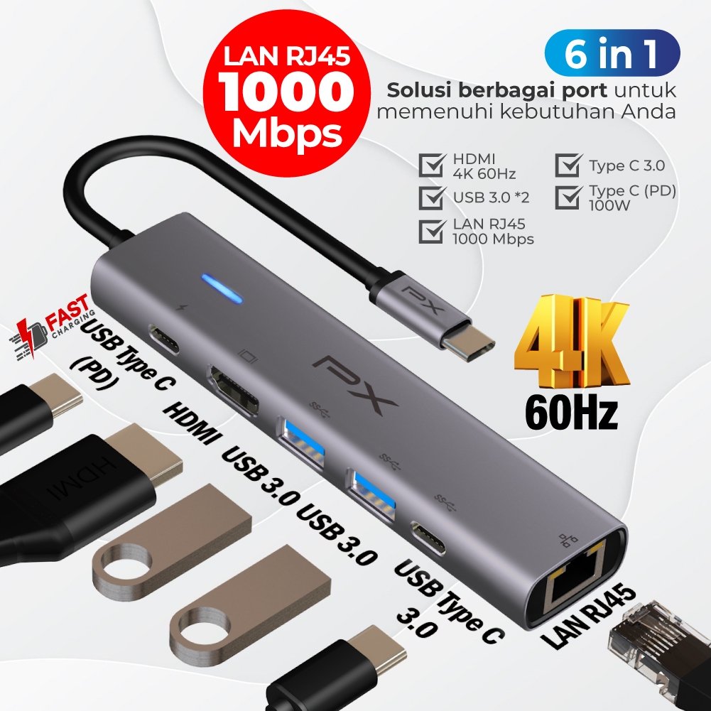 USB Type C 3.1 Type C Hub Converter HDMI 4K 60Hz USB 3.0 Type C LANRJ45 Laptop Macbook 6 in1 PX UCH4K606