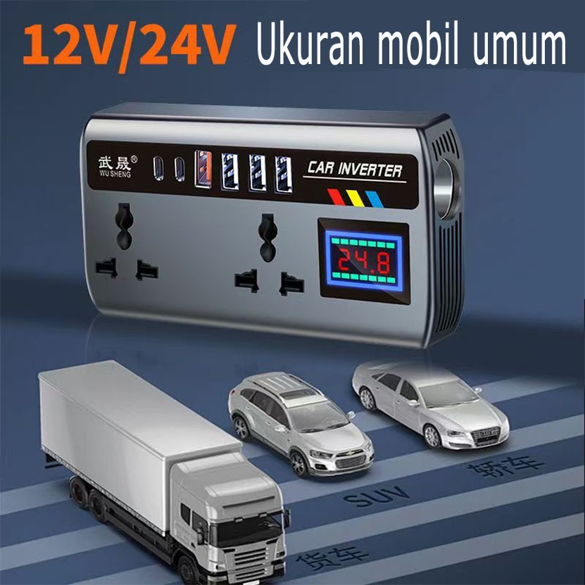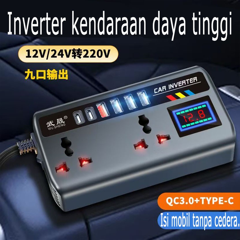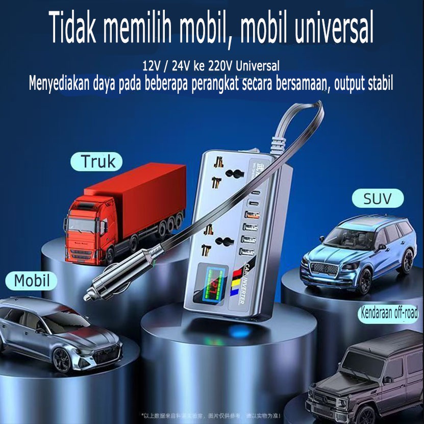 Inverter Mobil 220W Dual PD+QC3.0 - 2 Soket AC + USB + Type C + Port Rokok, AI Protection & Display Voltage