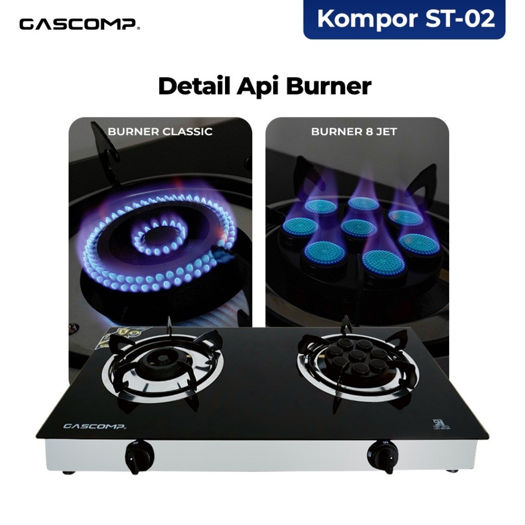 GASCOMP Kompor Gas Meja Kaca Classic + 8 Jet | Kompor Gas 2 Tungku Elegan | Api Besar Hemat Gas | Kompor Dapur Modern