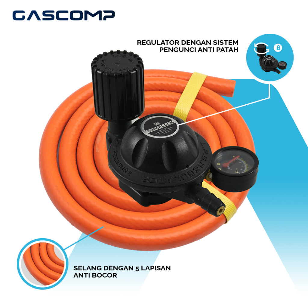 GASCOMP Paket Regulator Superlock Putar + Selang (GRS-925) Regulator Gas Anti Bocor SNI