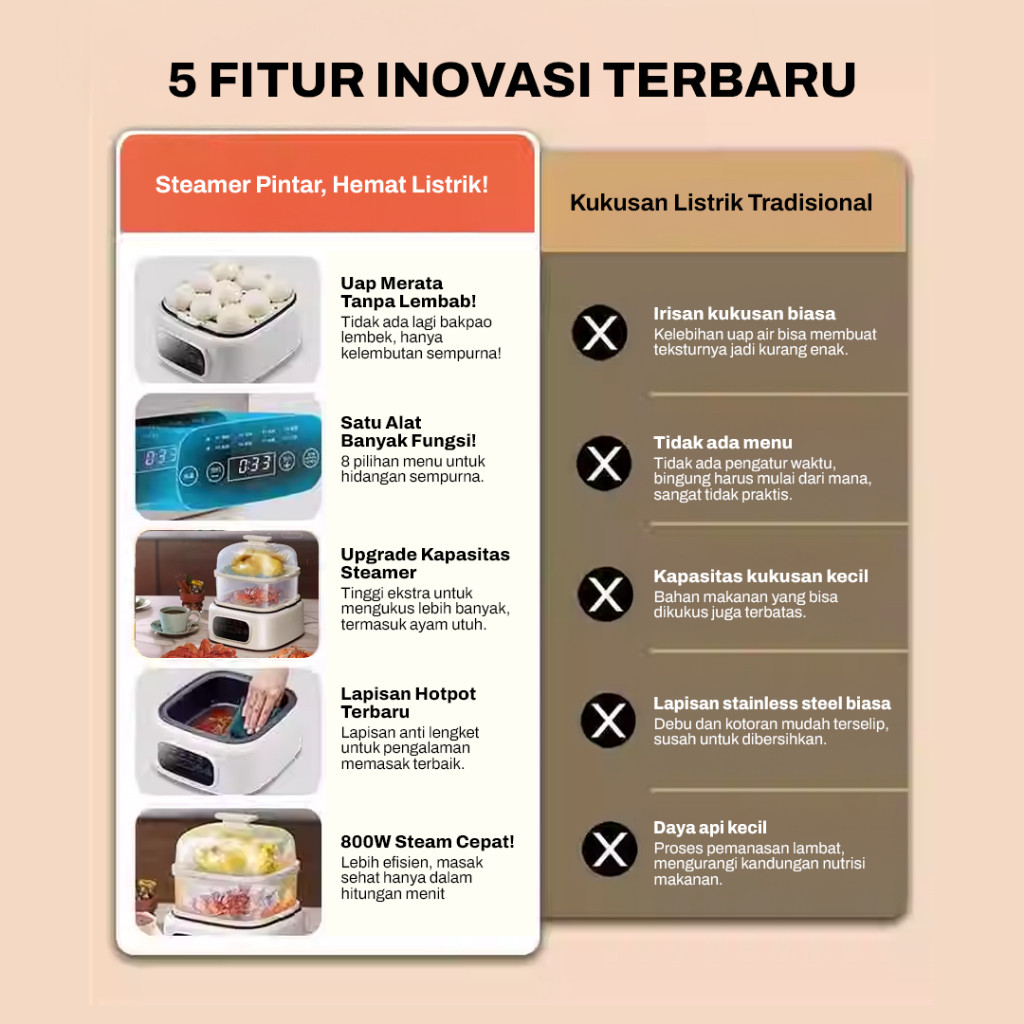 GASCOMP Electric Food Steamer Kapasitas 10L Low Watt Pengukus dan Penghangat Makanan Multifungsi