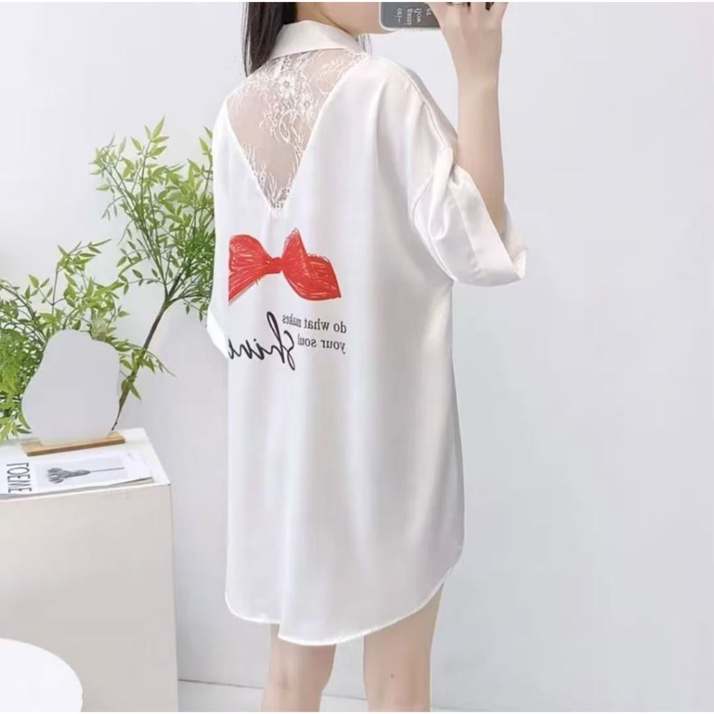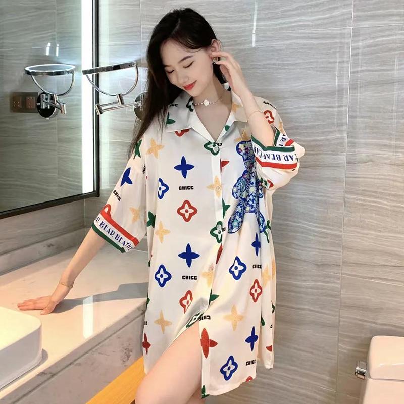 Dress tidur korea wanita jumbo sutra es premium print lucu piyama tidur wanita dress kemeja