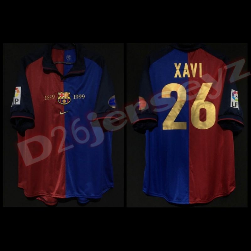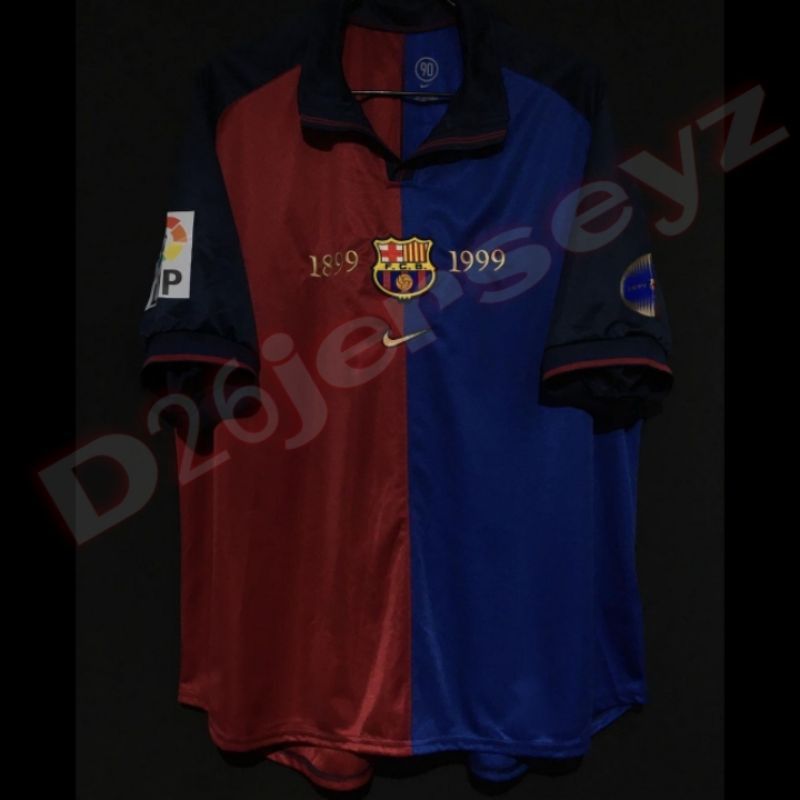 Jersey RETRO BarcaA_ Home Centenary 1999 Official + Cetak Nama Nameset Suka Suka Font RETRO + Patch