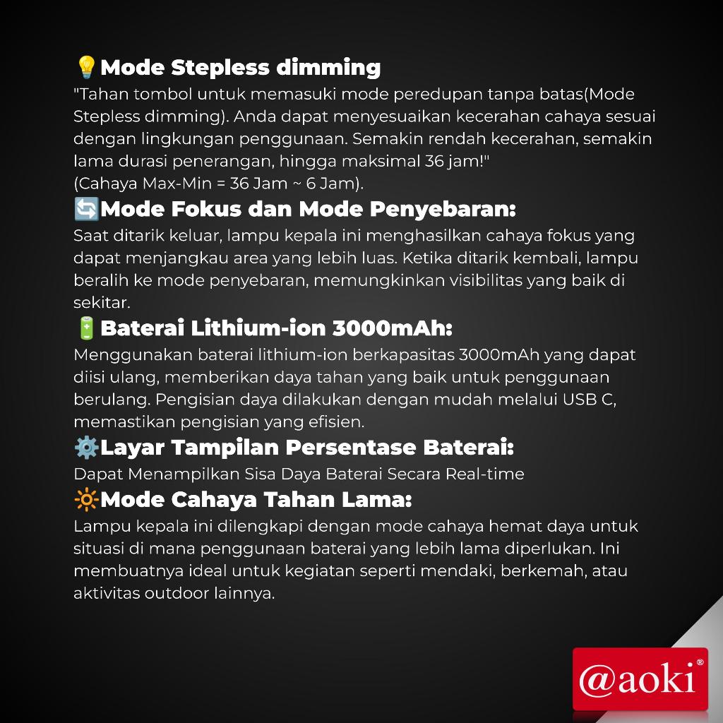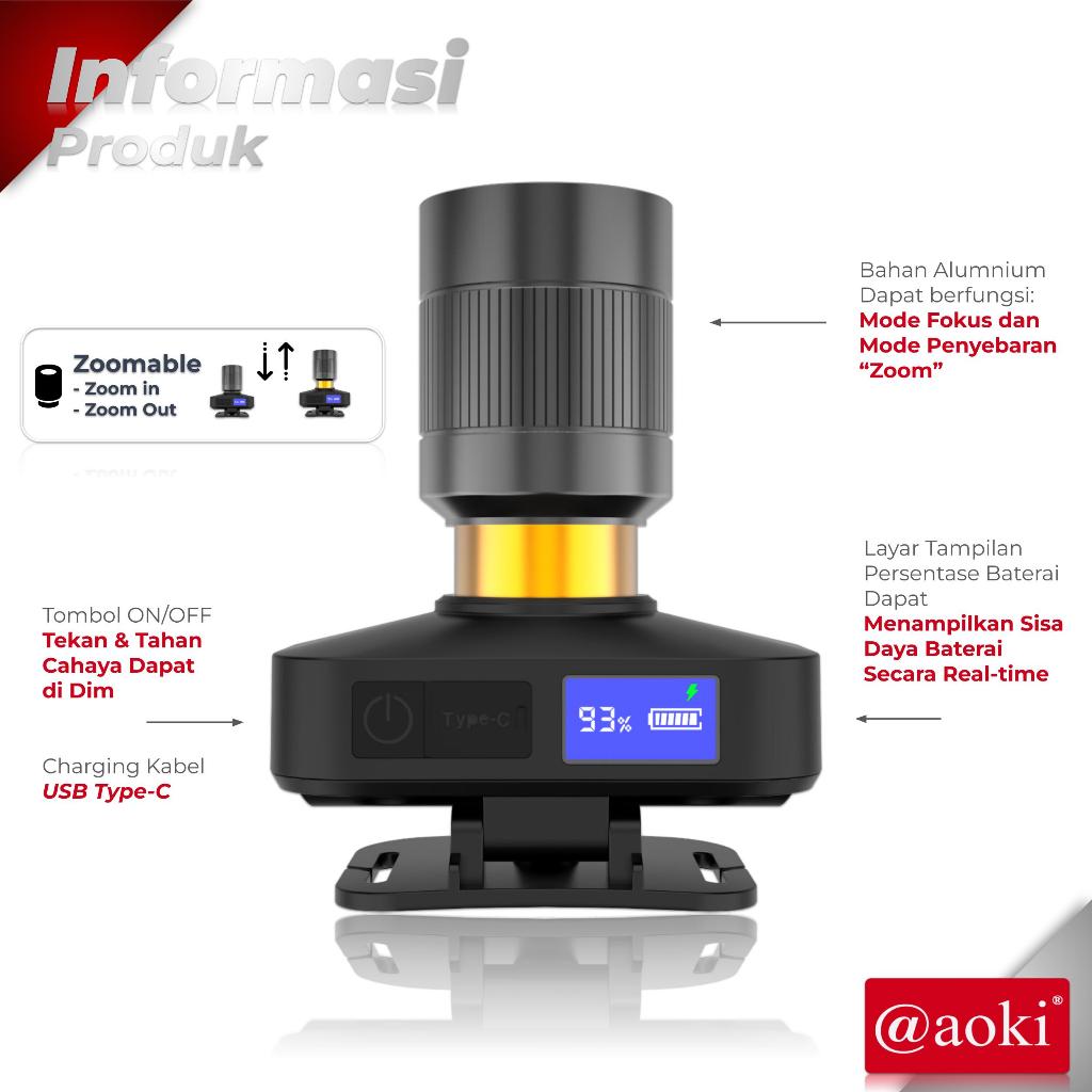 ALADIN_STORE AOKI Senter Kepala Zoom SmartBright Stepless dimming USB-C Layar Persentase Baterai Outdoor Ideal