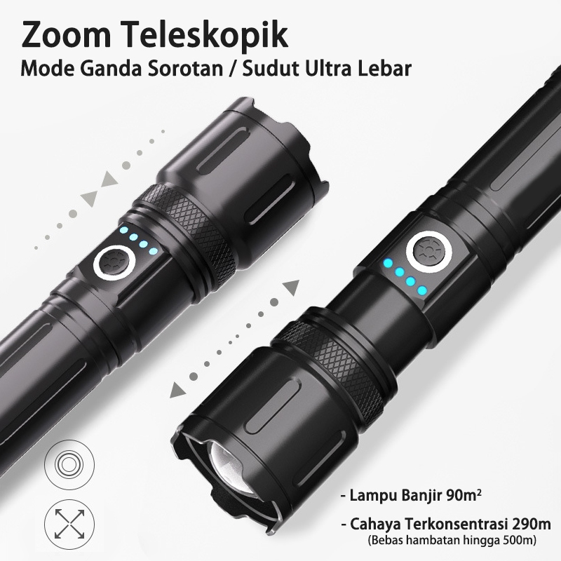 Akona Senter Led Super Terang 90000 Lumens USB-C Anti Air Lampu Senter Cas Swat Jarak Jauh Senter Berdaya Tinggi Zoom Multifungsi