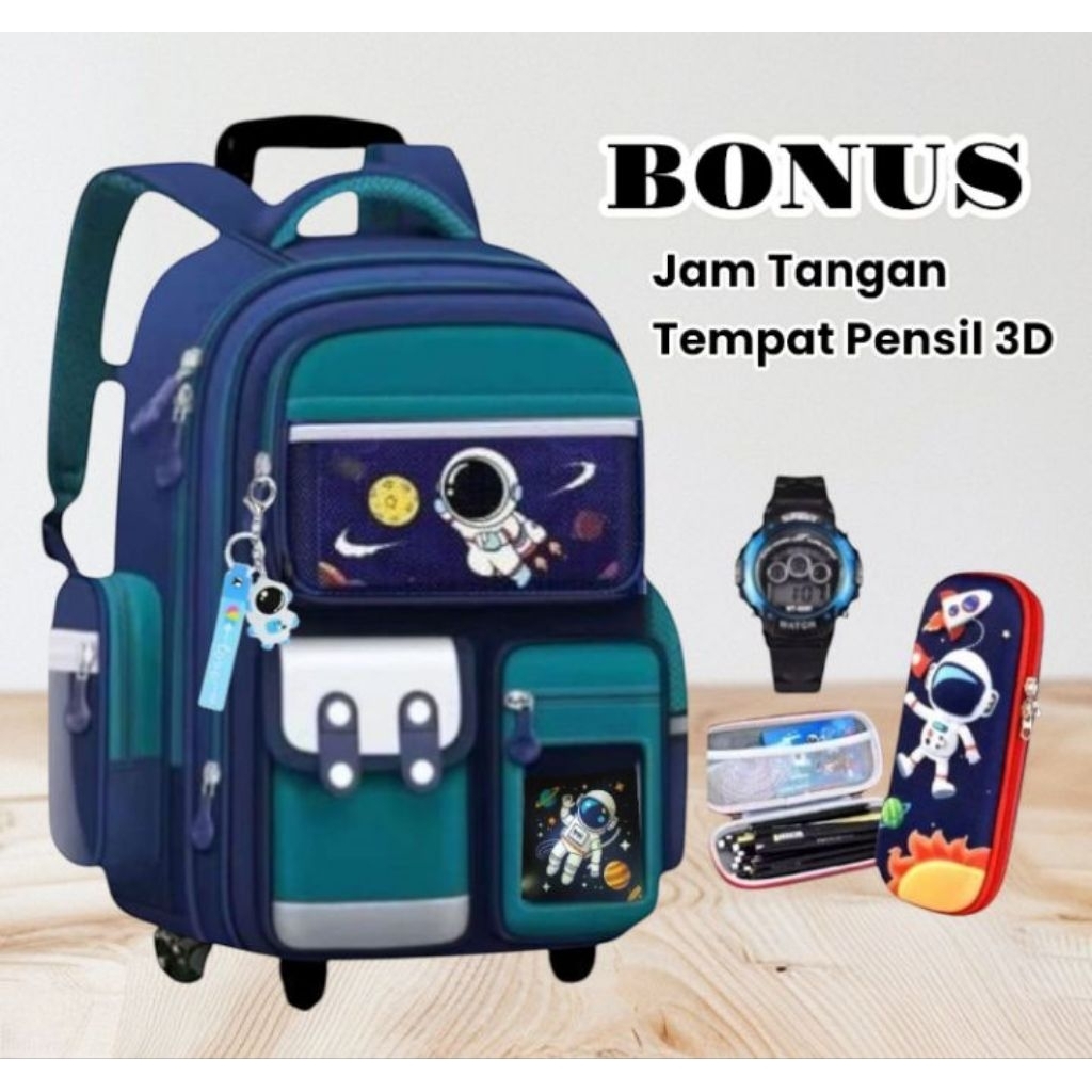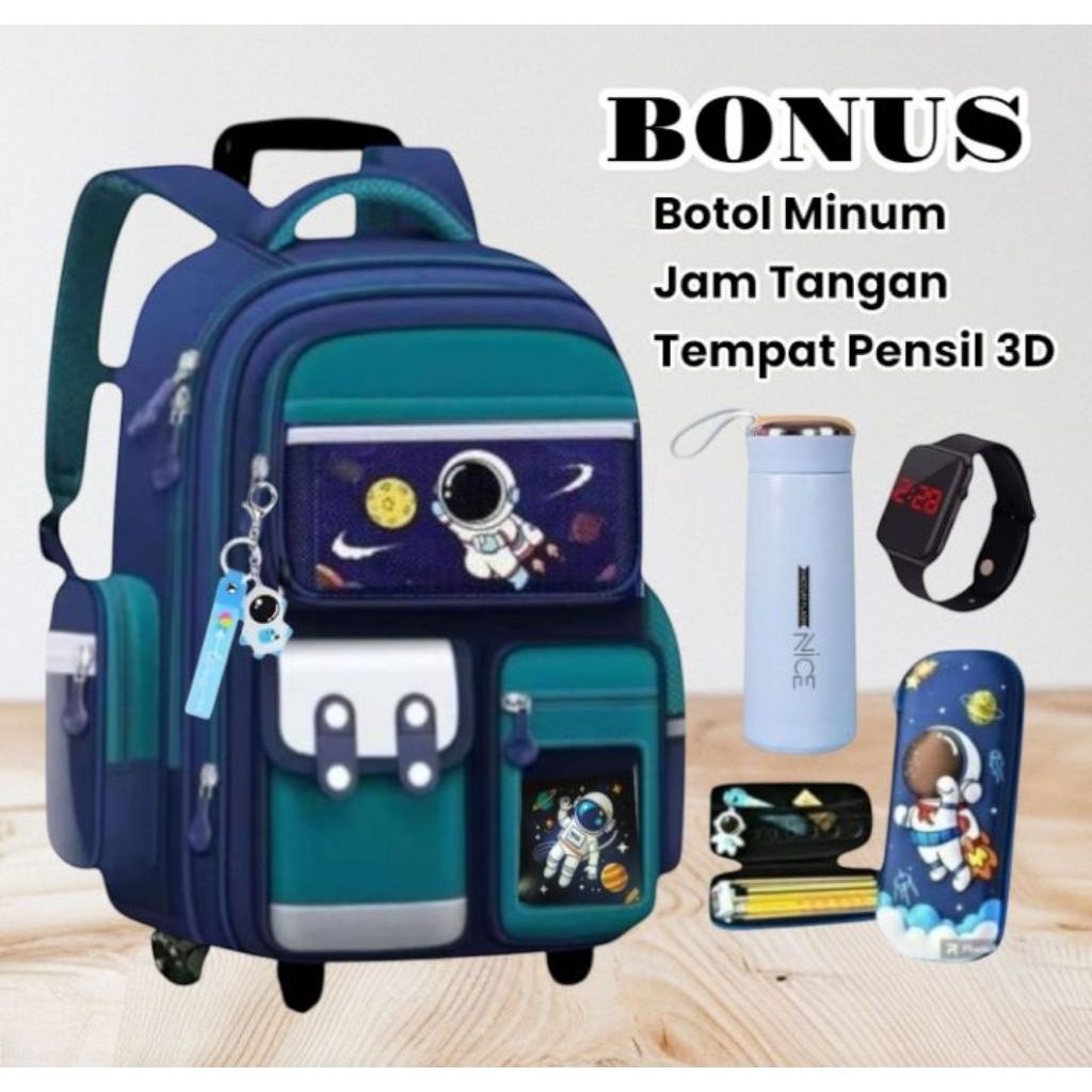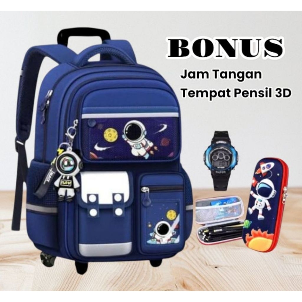 tas ransel Troly astro baru paket 4in1 dapat bonus tempat pensil 3D jam tangan botol minum dan raincover tas ransel Trol