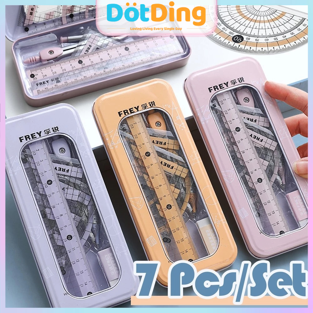 [DOTDING] 7PCS Kompas Set Matematika + Kotak Pensil Logam Tahan Lama - Alat Tulis Sekolah & Kantor Bonus Penggaris & Pe