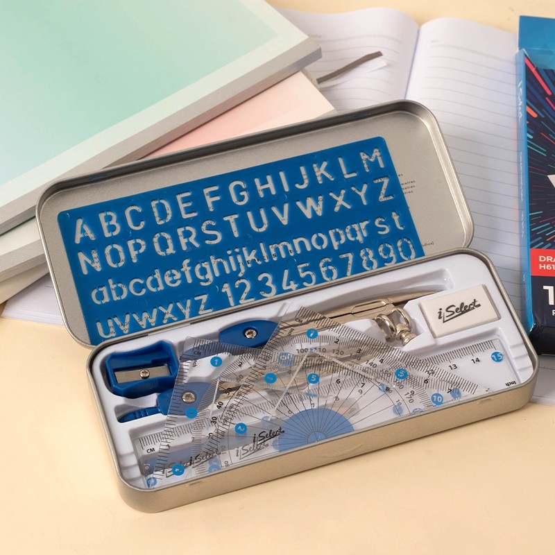 Deli I-Select Jangka Set Penggaris Sekolah Isi 10 Pcs Gratis Penghapus Drafting Set Box Metal H619