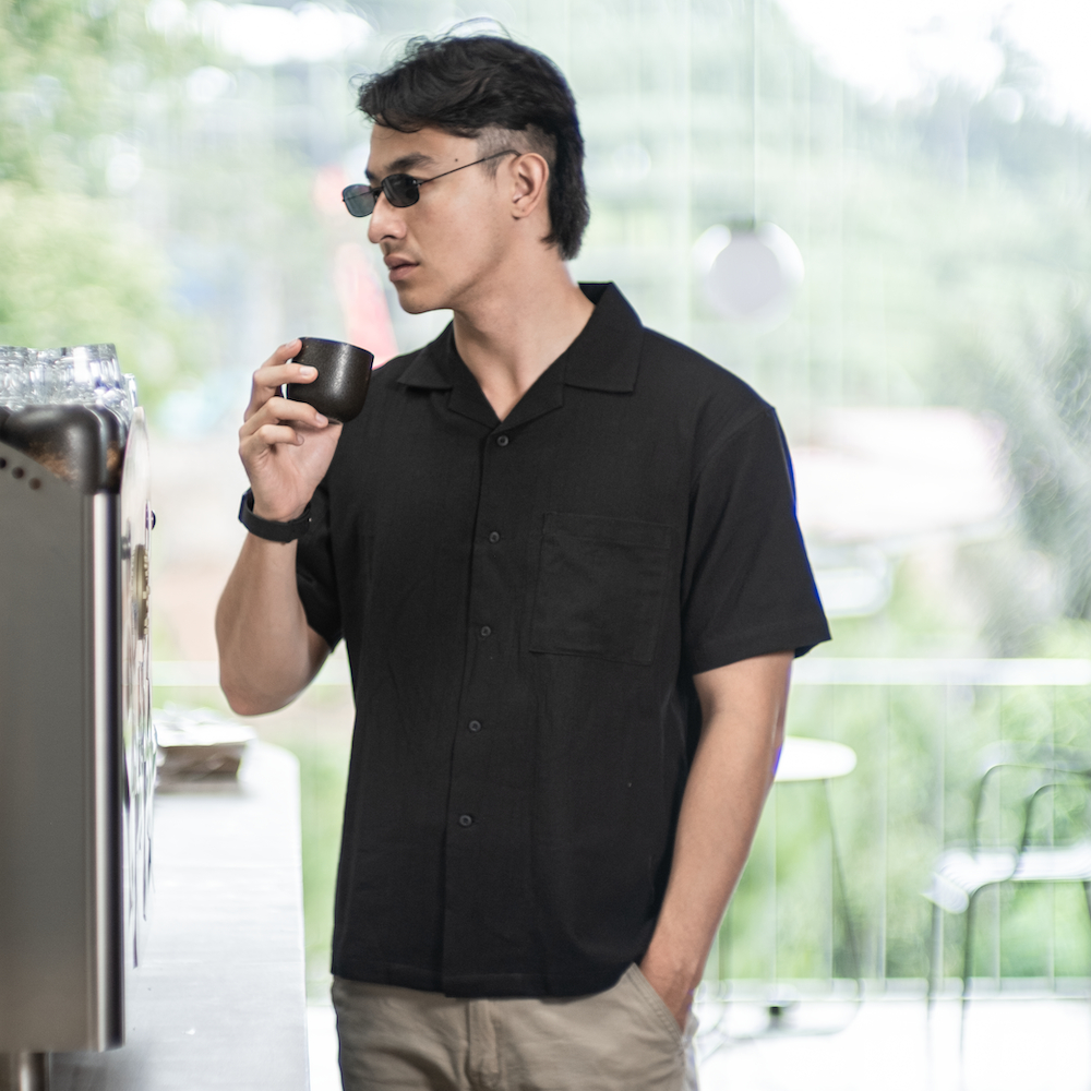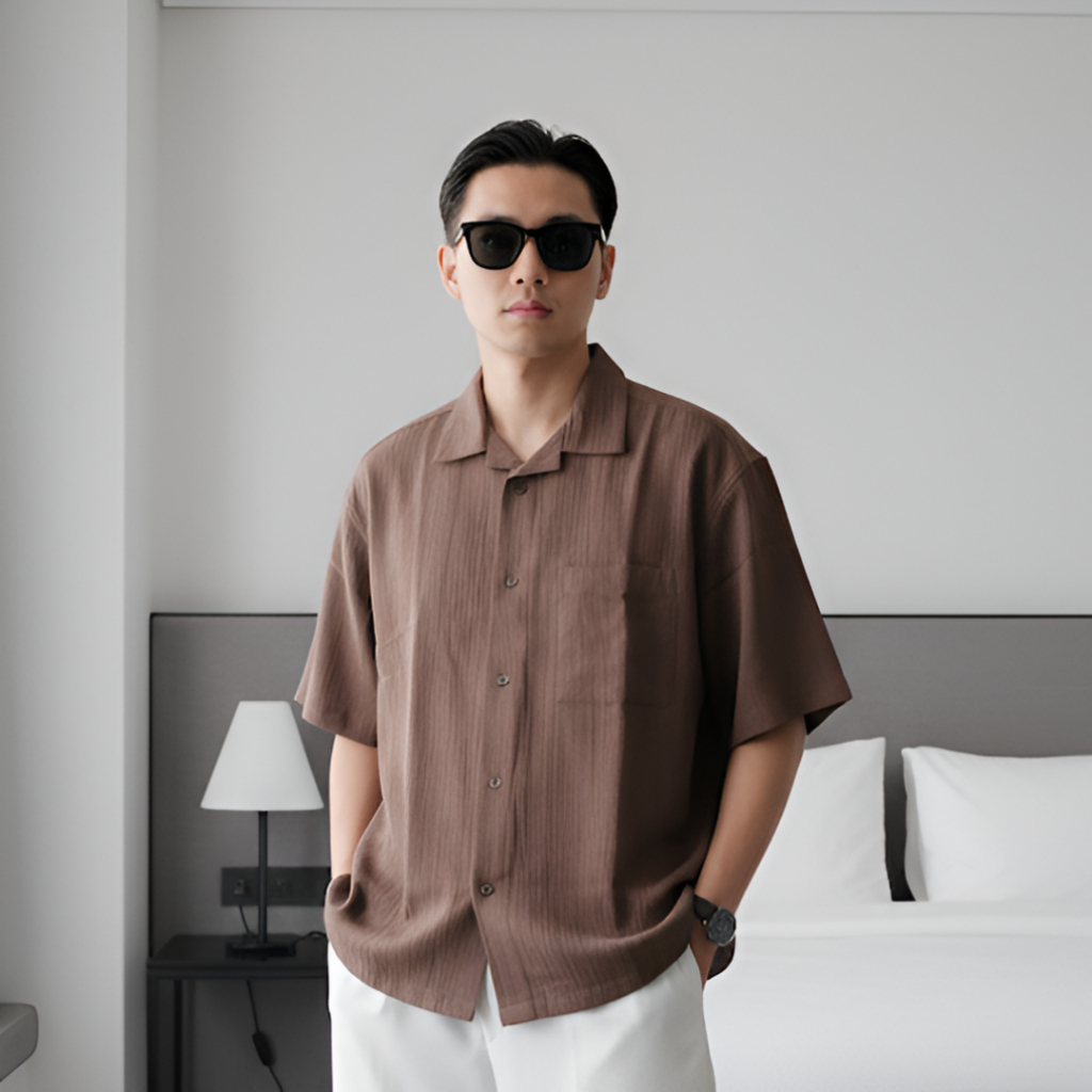 Cottongo Kemeja Open Collar Linen Cuban Bowling Oversized Shirt Dark Brown