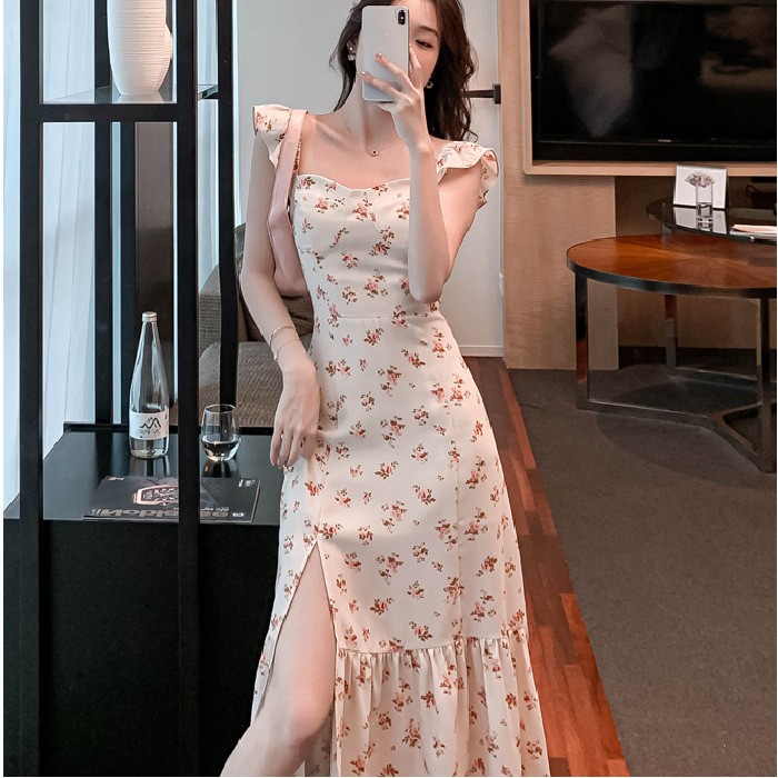 [Mall] Dress Wanita Korea Newlan Qz081 Butterfly Sleeve Cream Midi Dress With Slit - Dress Casual Kasual / Korean Dress