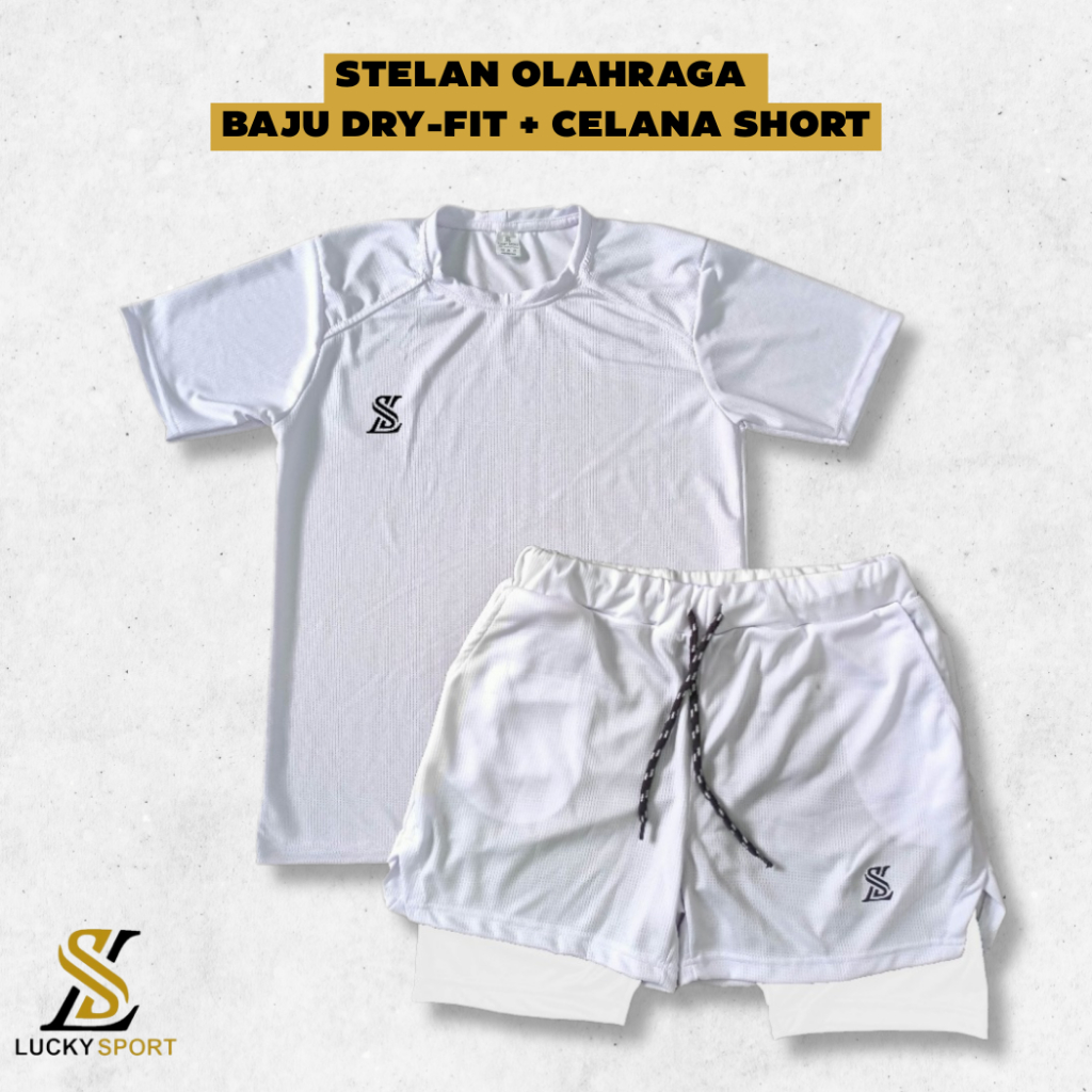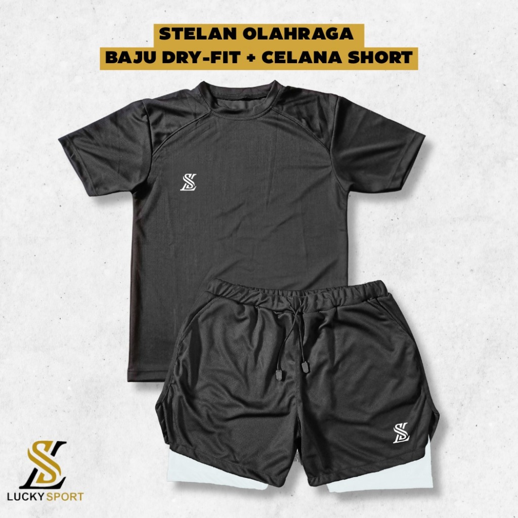 Setelan Olahraga Pria Double Layer 1 Set Baju Kaos Dryfit Celana Pakaian Outdoor Running gym lari Badminton Volly Futsal