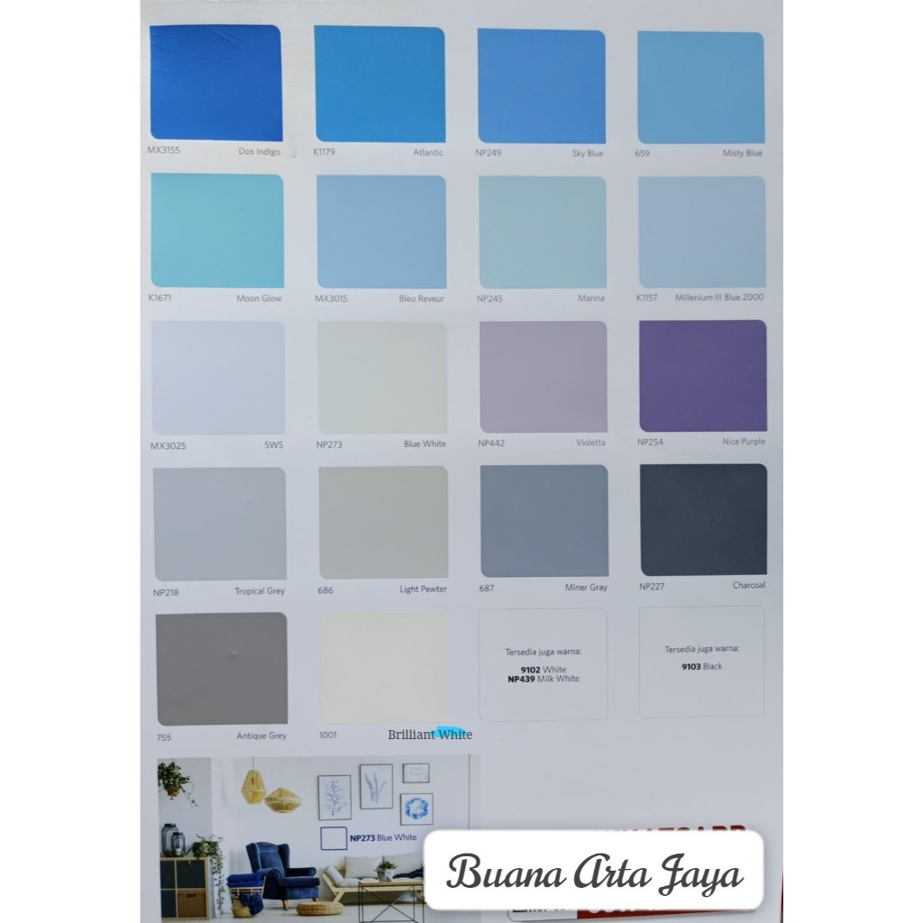 PUTIH SUPER KENTAL, 9102 Putih, SW Super White, 1001 Brilliant White, BS 9103 Black, 1158 Teracotta, 1675 Mustard, 1686 Soft Jalapeno, 602 Durian, 631 Yellow KMX, 657 Bright Green, 659 Misty Blue, 6604 Smeraldo, 661Pink, 667 Mint Green, 675 Cottage Carrot, 678 Hibiscus Red, 686 Light Pewter, 687 Miner Gray, 755 Antique Grey, BGG1619T Green Gauze, BGG1681D SpringVigor, BS3033 Broken White, BS3040 Cream, BS8090 Sakura, K1157 M III Blue2000, K1179 Atlantic, K1671 Moon Glow, MX3004 Confire Rose, MX3011 Honey Sky, MX3015 Blue Reveur, MX3025 SWS, MX3030 Vert Clair, MX3031 Jaune Frais, MX3149 Rouge, MX3155 Dos Indigo, NP 200 Crystal Lime, NP 211 Yellow, NP 213X Lime Green, NP 218 Tropical Grey, NP 222 Latansa Green, NP 227 Charcoal, NP 230 Jasmine, NP 231 Harbor BLue, NP 233 Green Freeway, NP 234 Earth Yellow, NP 236 Cucumber, NP 237 Light Lime, NP 238 Lettuce, NP 240 Honey Tone, NP 243 Lily White, NP 245 Marina, NP 247 Goby Sands, NP 249 Sky Blue, NP251X Sunset Yellow, NP 253X Autumn Green, NP 254 Nice Purple, NP 273 Blue White, NP 437 Corn Flake, NP 438 Soft Spring, NP 439 Milk White, NP 440 Natural Cream, NP 441 Summer Hay, NP 442 Violetta