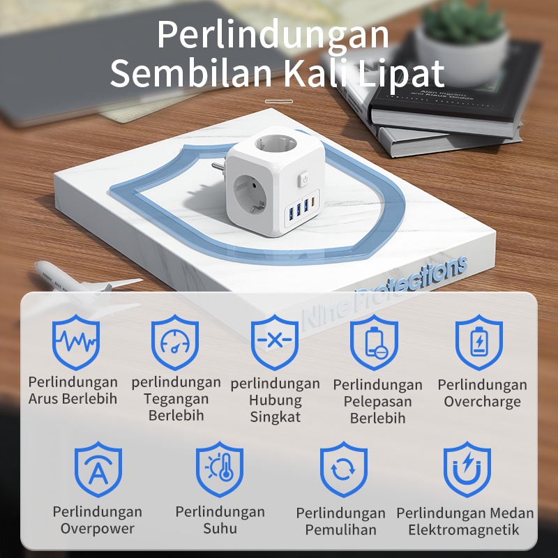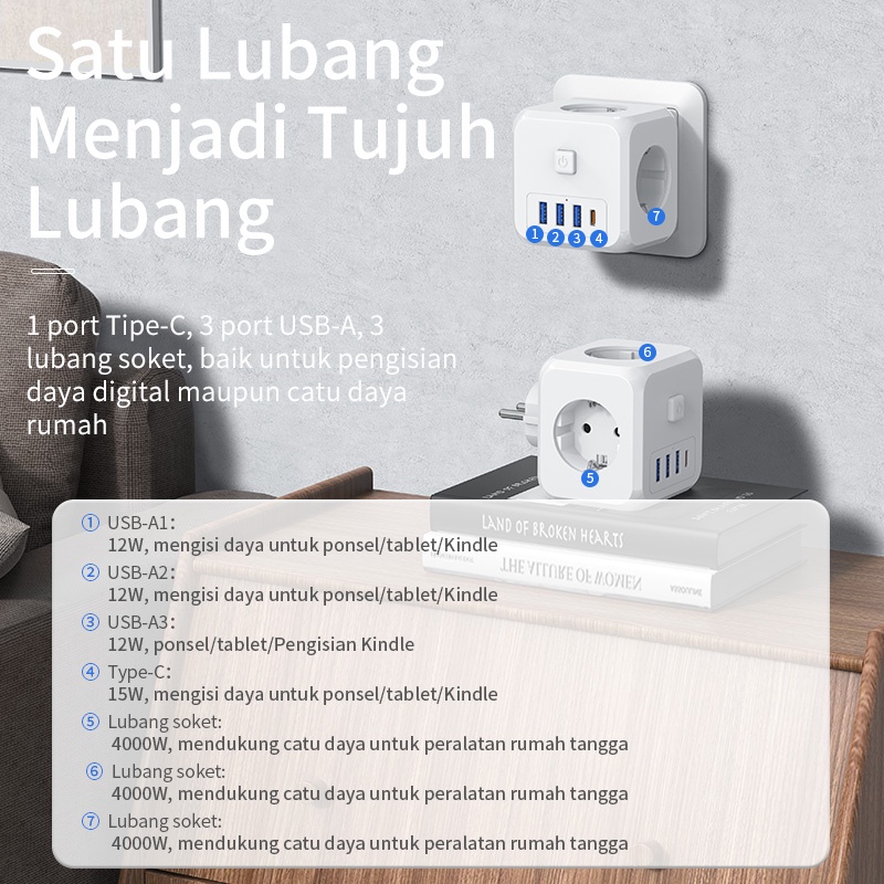 (HOT)KIVEE Stop kontak colokan listrik kubus 7-in-1 USB+Type C Fast charging Daya Max 4000W