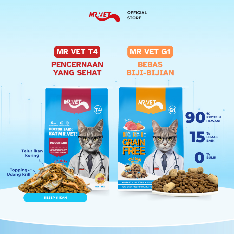 Mr. Vet - Makanan Kucing Kering Mr.Vet 1KG T1 Digestion/T2 Hair & Skin/T3 Urinary/T4 Cat Indoor Care/G1 Grain Free Catfood