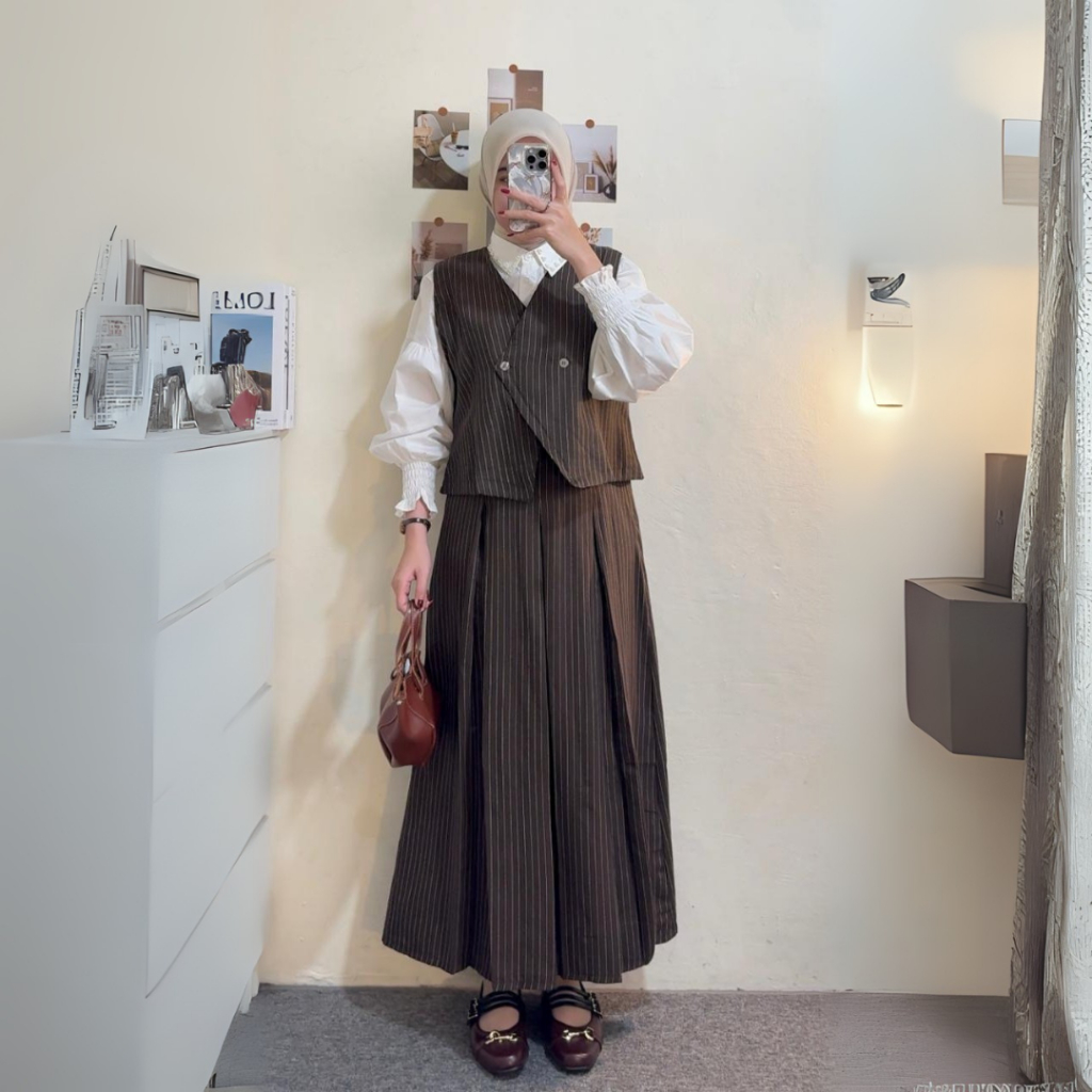 BABINA STORE EMWEHA Set Vest Rok Camie Setelan Wanita Kekinian Stripe Casual Korean Style Bahan Semiwoll