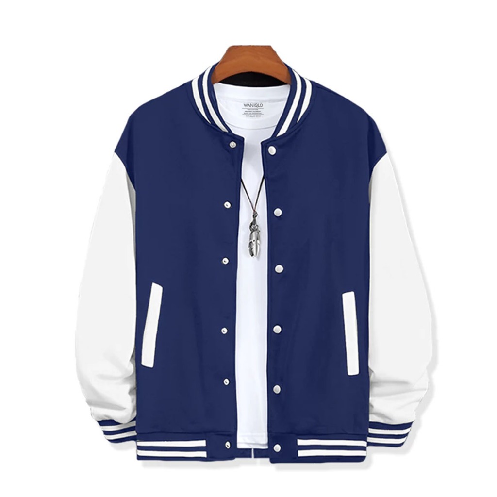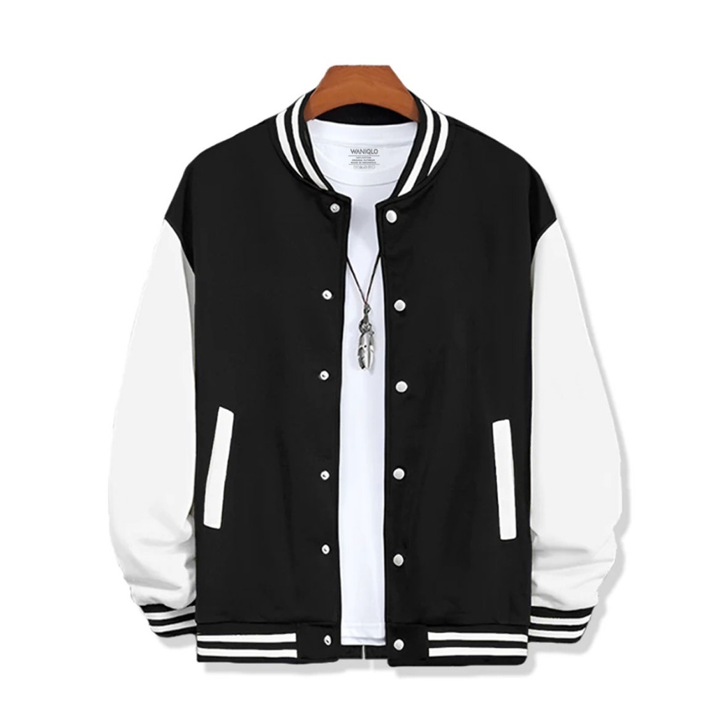 NOEH TOKO ONNLINE Waniqlo - Jaket Varsity Baseball Kancing Polos- Hitam Putih