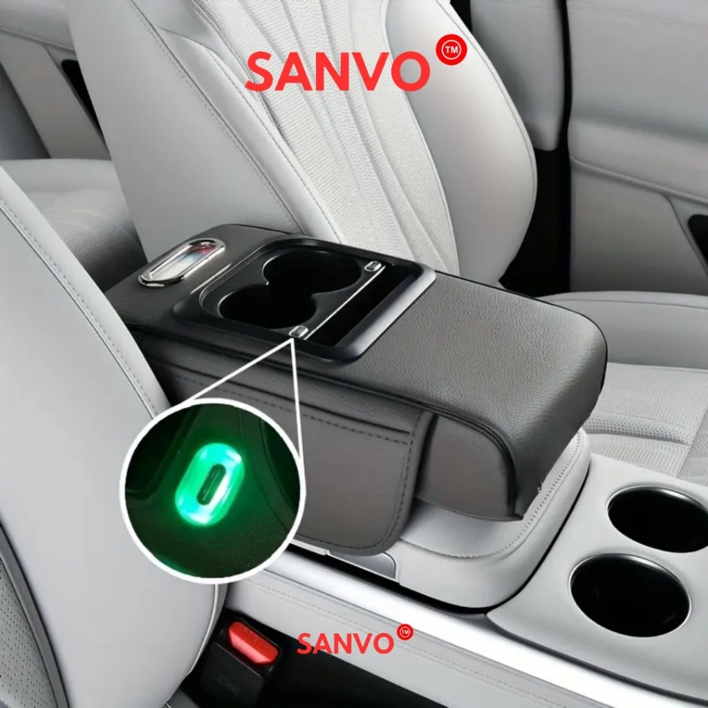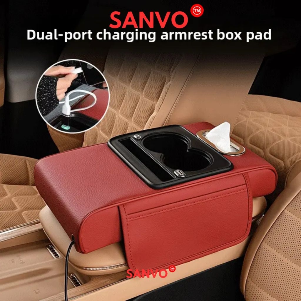 Sanvo Armrest Pad Mobil + USB Charging HP + Kotak Tisu Mobil Tempat Botol 5 In 1 Premium Quality / Console Box Storage /