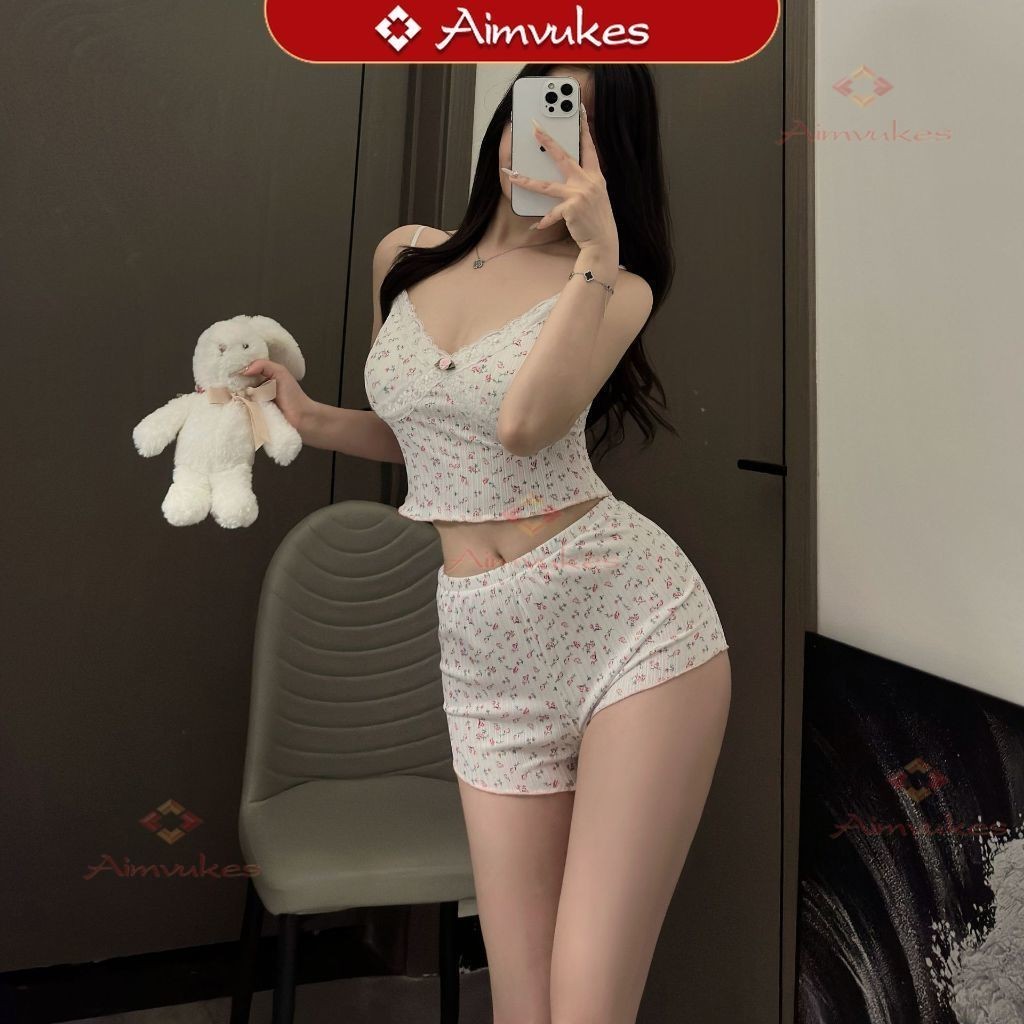 BABINA STORE 【Aimvukes】Terlaris Baju Tidur Piyama Wanita Setelan Set Tank Top Celana Pendek V Neck Bunga Sling Manis Sexy French SIZE 40-100KG
